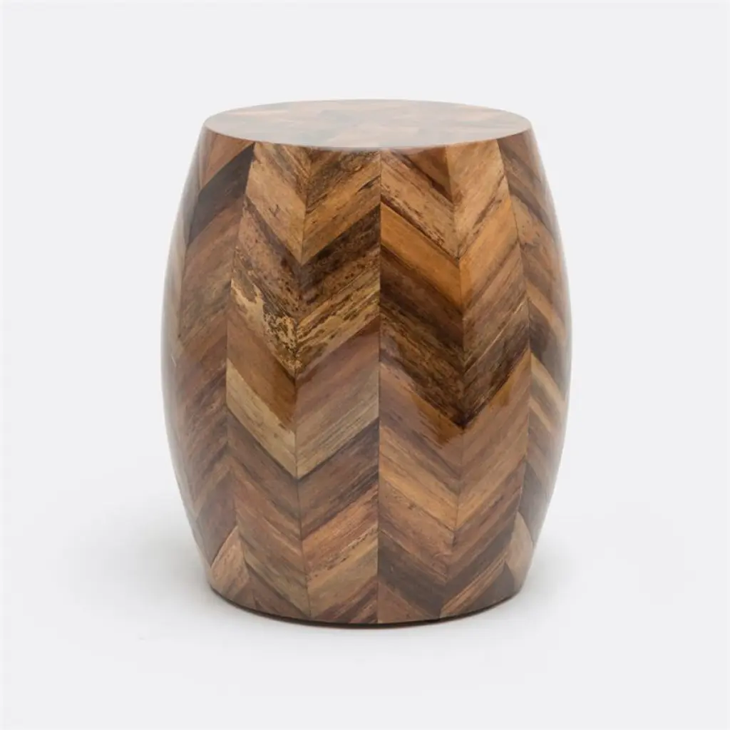Barrel-shaped stool has a retro vibe and can also serve as a side table. Gorgeous natural variations of color and texture in the hand laid banana bark herringbone pattern and starburst top are highlighted by the high gloss polished finish.