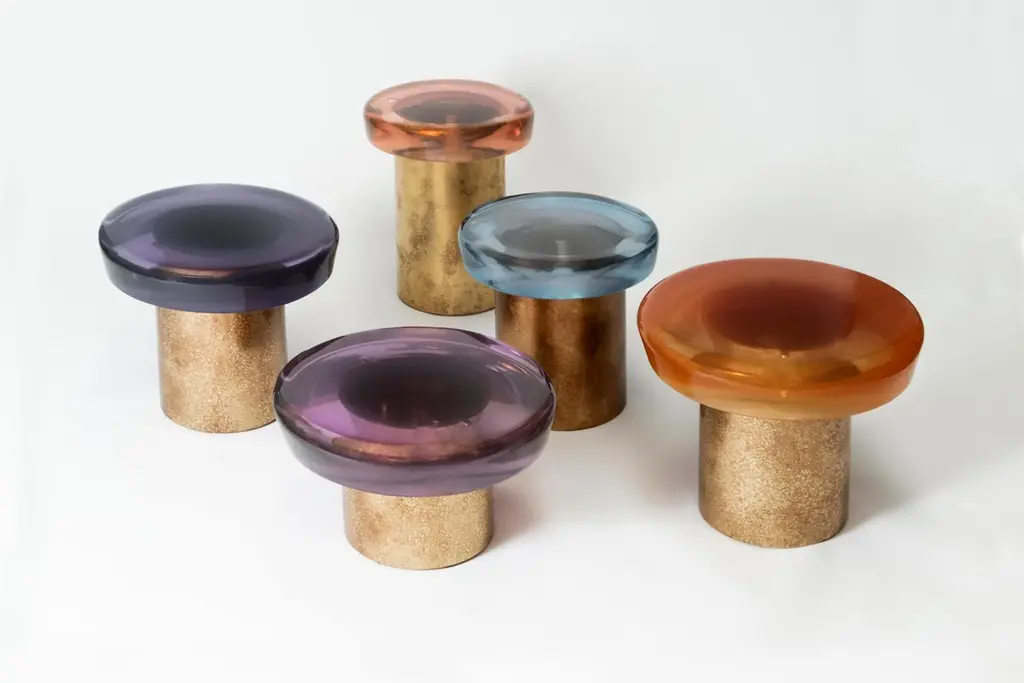 Jade stool by Draga & AurelDimensions: W 40, D 40, H 46, top Ø 40 cmMaterials: Resin and bronzeFormed from a combination of reflective resin and solid brass, the Jade coffee tables look like precious gems. The surface is made by hand in resin of 10 cm high: each one takes over a week to cast. Thanks to a handcrafted surface treatment, special brass veins characterize the structure of the coffee tables. Inspired by the magical mineral color palette of Transparency matters, these coffee tables are featured by ethereal transparency, luxurious sensitivity, and a reflective surface that plays poetically with the light, reflecting your gaze as a functional work of art.Founded in 2007 in the town of Como, Italy, Draga & Aurel is a multidisciplinary design studio that works along the spectrum of furniture, textile and interior design. Draga Obradovic began her career in the fashion industry, first working in London and Milan as a textile designer before eventuallysettling in Como. Aurel K. Basedow graduated from Milan’s Accademia di Belle Arti with a degree in Fine Arts, having previously trained as a carpenter and woodworker. Thanks to their sympathetic methods, combined with an artist’s approach to material and composition Draga & Aurel are widelyrecognized for their clever reinvention of bespoke vintage design pieces.Their showing at 2009 Salone del Mobile introduced the duo to the world stage; it followed the partnerships with several companies that have pushed the pair’s domain beyond the reinvention of singular vintage pieces. While interior projects have expanded their sought after aesthetic into the realm of hospitality and lifestyle. In occasion of the 2019 Milan Design Week the design duo presented Transparency Matters, an exhibition of limited edition pieces, entirely fabricated by hand in their Como atelier.