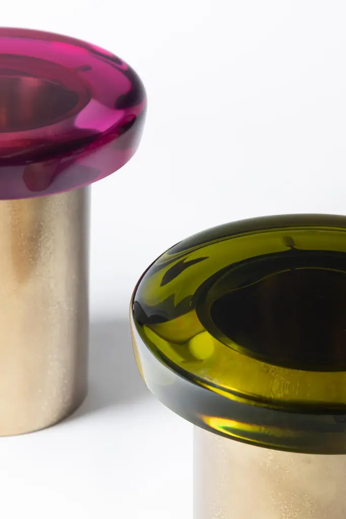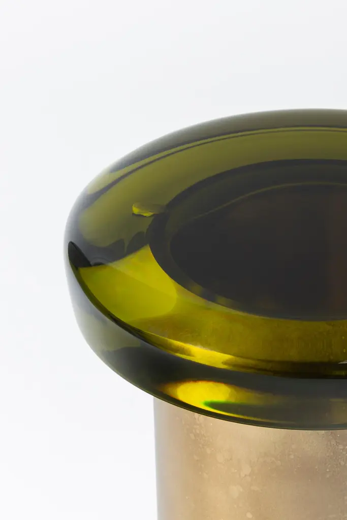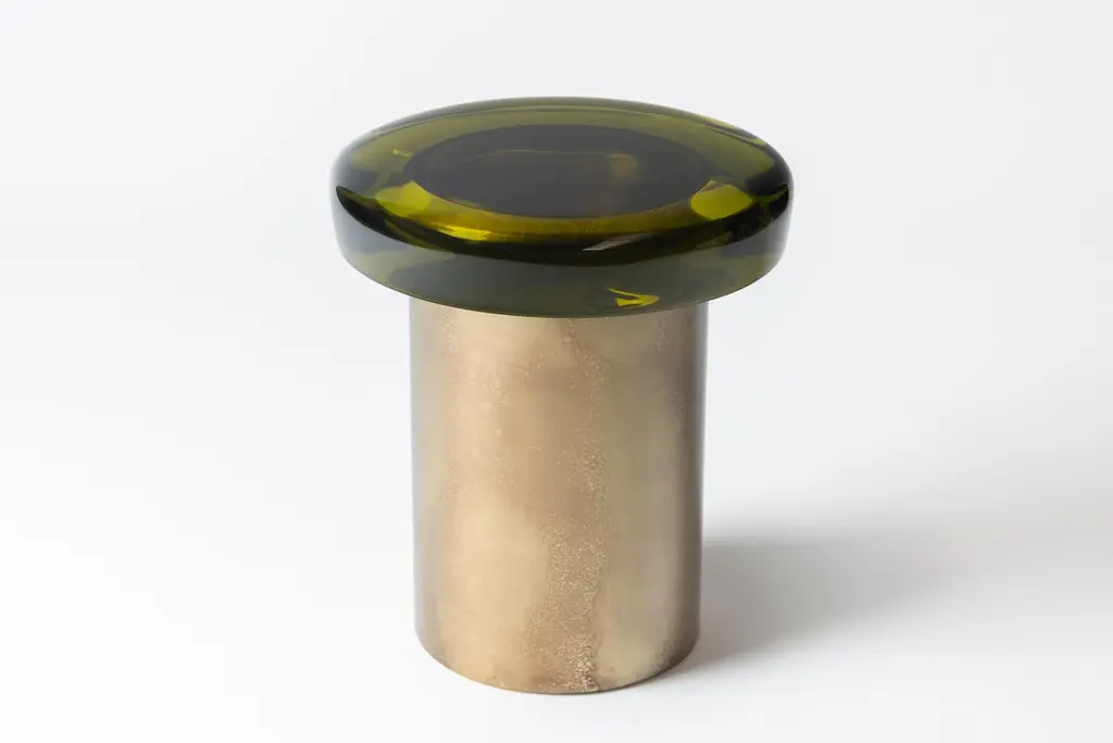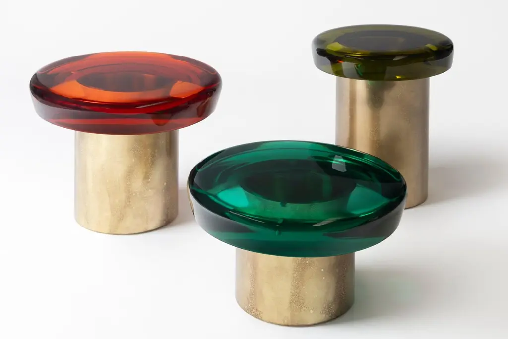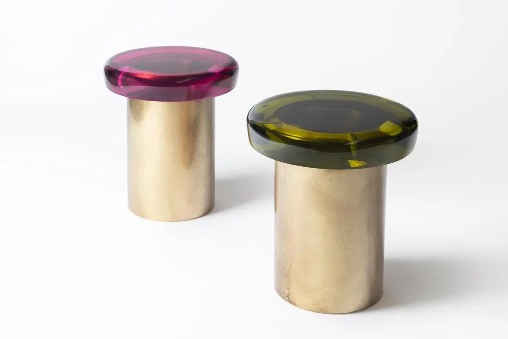 Jade stool features ethereal transparency and a reflective surface that plays naturally with light. The brightly colored seat rests on a cylindrical brass base, whose distinctive veining is achieved through a skillful etching treatment. The juxtaposition of the everunique shades — meticulously blended in our atelier — and the golden accents makes it a precious piece. All of the epoxy resin tops belonging to this series are designed to be interchangeable.SIZE: L 40, W 40, H 46 Top Ø 40 cmDraga&Aurel resin colors are absolutely unique as they are handmade using a combination of different shades.