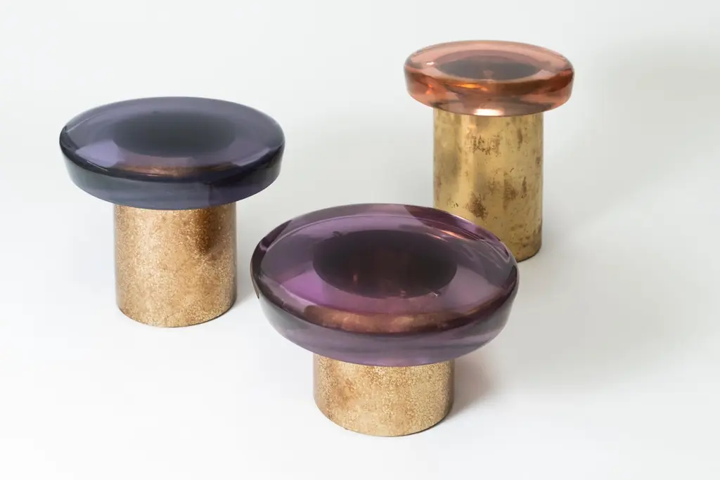 Jade stool features ethereal transparency and a reflective surface that plays naturally with light. The brightly colored seat rests on a cylindrical brass base, whose distinctive veining is achieved through a skillful etching treatment. The juxtaposition of the everunique shades — meticulously blended in our atelier — and the golden accents makes it a precious piece. All of the epoxy resin tops belonging to this series are designed to be interchangeable.SIZE: L 40, W 40, H 46 Top Ø 40 cmDraga&Aurel resin colors are absolutely unique as they are handmade using a combination of different shades.
