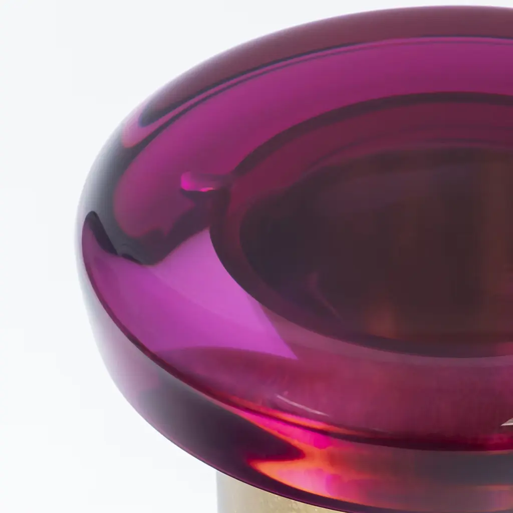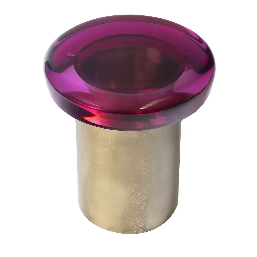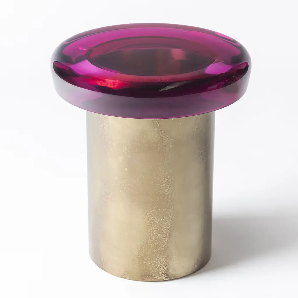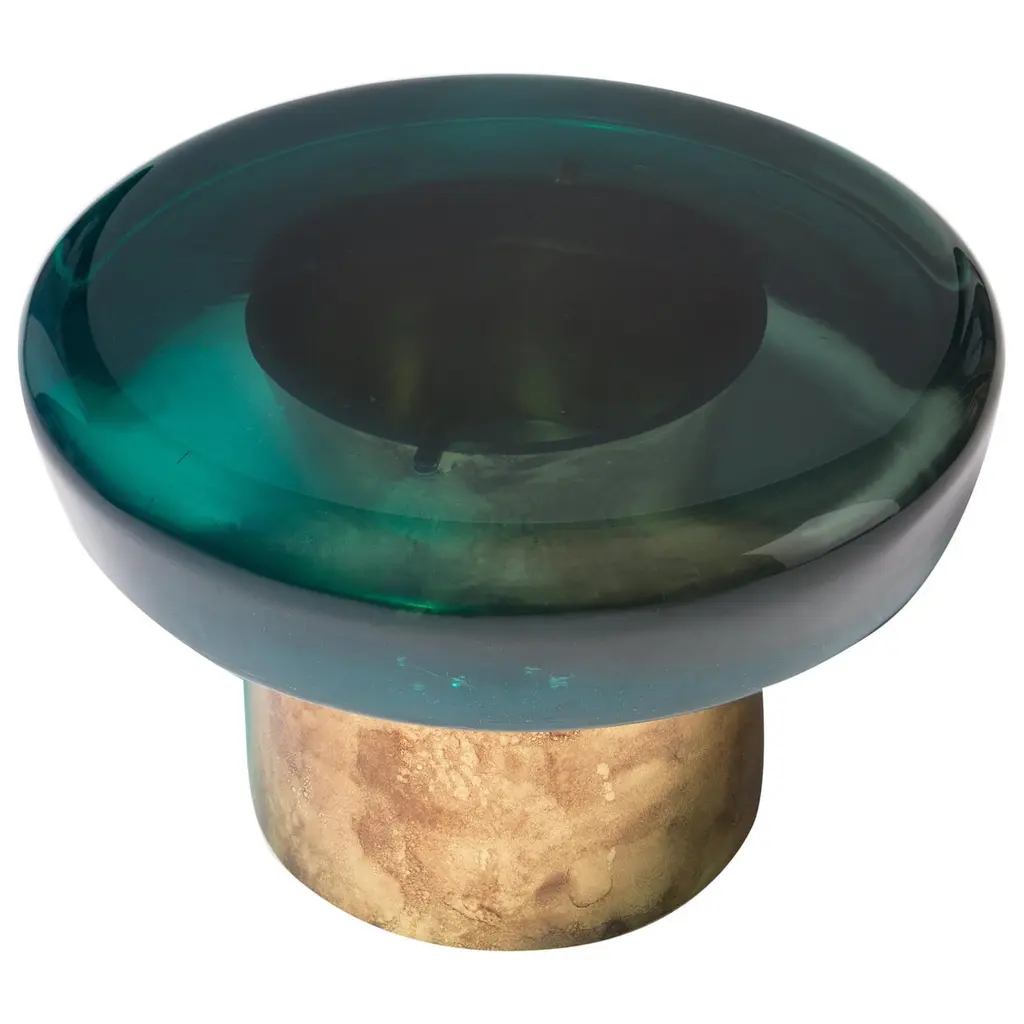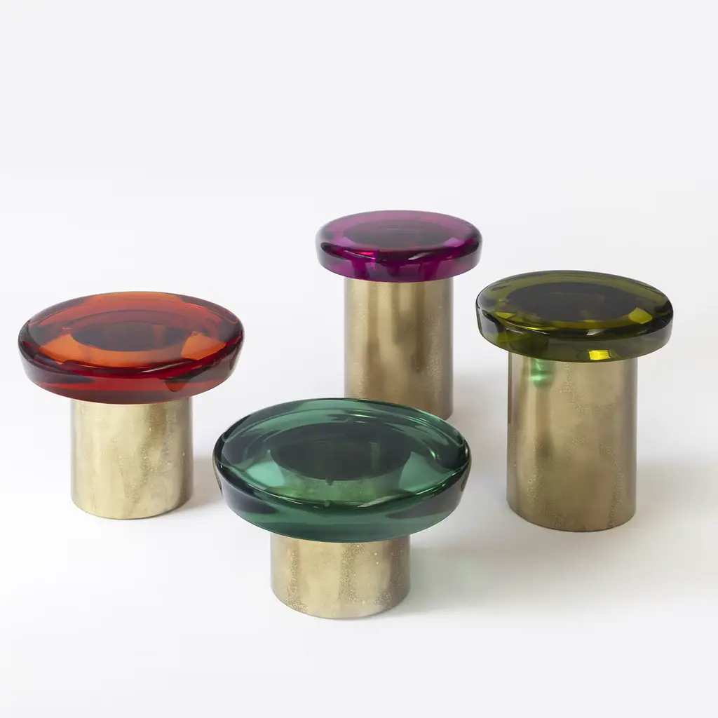 Jade stool features ethereal transparency and a reflective surface that plays naturally with light. The brightly colored seat rests on a cylindrical brass base, whose distinctive veining is achieved through a skillful etching treatment. The juxtaposition of the ever-unique shades — meticulously blended in our atelier — and the golden accents makes it a precious piece. All of the epoxy resin tops belonging to this series are designed to be interchangeable. Available in different colors.