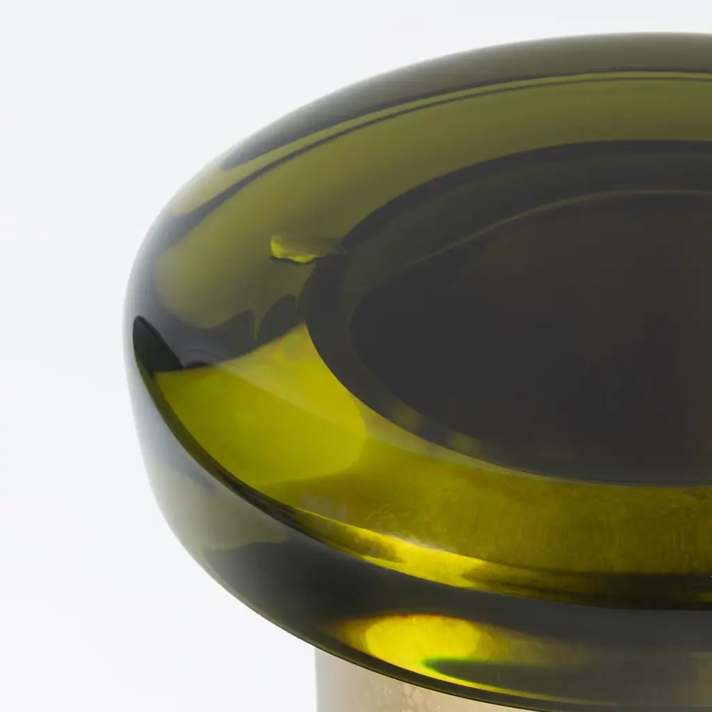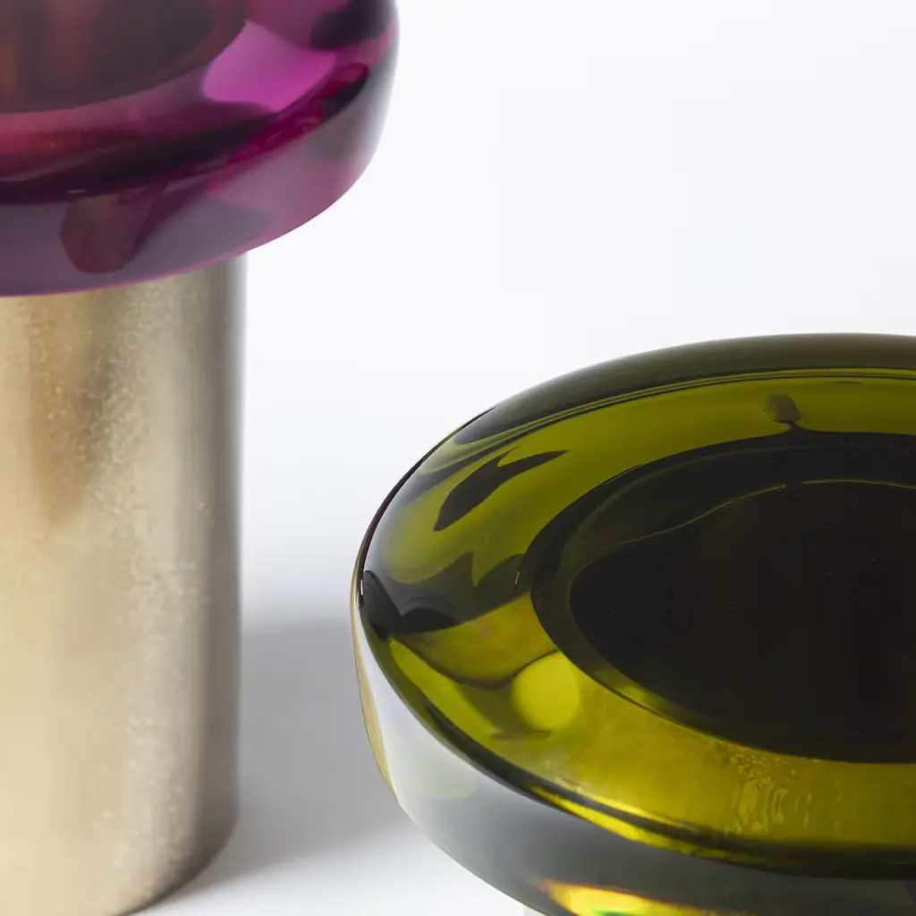 Jade stool features ethereal transparency and a reflective surface that plays naturally with light. The brightly colored seat rests on a cylindrical brass base, whose distinctive veining is achieved through a skillful etching treatment. The juxtaposition of the ever-unique shades — meticulously blended in our atelier — and the golden accents makes it a precious piece. All of the epoxy resin tops belonging to this series are designed to be interchangeable. Available in different colors.