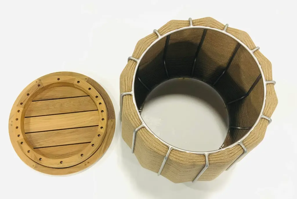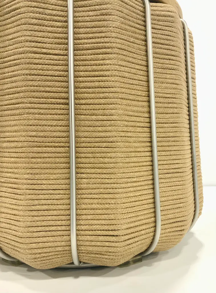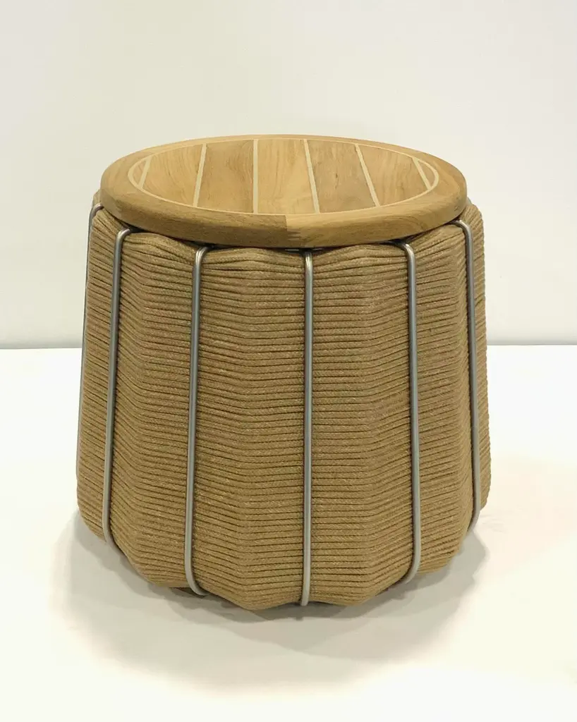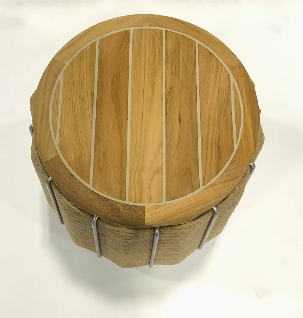 Original Retail $3897, stylish Jamie Durie for Baker / McGuire Satsuma Outdoor Stool/Planter, stacked jute body with silver finished metal, wood top, also a side table