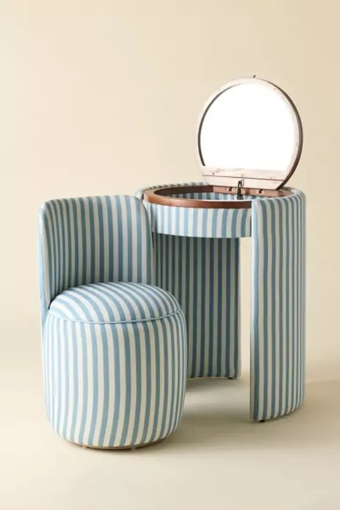 A mid-century modern addition to your morning regimen, this new & improved Jane Mirror Vanity & Stool Set offers a versatile and compact solution to your smallest spaces. Cylindrical vanity features a fold-down mirror equipped with soft-close hinges, so you can effortlessly turn your space into a desk. Complete with a chair that fits perfectly underneath your vanity. **Features** \- Jane Mirror Vanity & Stool in a new & improved construction \- Cylindrical silhouette - each piece fits together for tidy, compact storage \- Fold-down mirror built into the vanity \- Cushioned vanity chair \- Arrives fully assembled **Content + Care** \- Includes vanity & stool \- Arrives fully assembled \- Acacia wood, mango wood, MDF, mirror, iron, polyfiber filling, cotton \- Spot clean \- Imported **Size** \- Vanity dimensions: 25"l x 23.6"w x 31"h \- Stool dimensions: 19.75"dia x 31"h \- Leg height/Clearance: 25.6" \- Interior seat dimensions: 19.7"l x 17.1"w x 20"h \- Weight: 62.8 lbs \- Shipping package dimensions: 29"l x 30"w x 35"h \- Shipping package weight: 79.4 lbs
