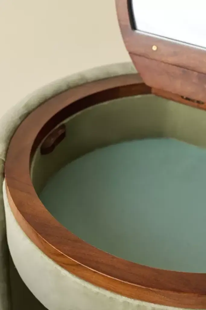 A mid-century modern addition to your morning regimen, this new & improved Jane Mirror Vanity & Stool Set offers a versatile and compact solution to your smallest spaces. Cylindrical vanity features a fold-down mirror equipped with soft-close hinges, so you can effortlessly turn your space into a desk. Complete with a chair that fits perfectly underneath your vanity. **Features** \- Jane Mirror Vanity & Stool in a new & improved construction \- Cylindrical silhouette - each piece fits together for tidy, compact storage \- Fold-down mirror built into the vanity \- Cushioned vanity chair \- Arrives fully assembled **Content + Care** \- Includes vanity & stool \- Arrives fully assembled \- Acacia wood, mango wood, MDF, mirror, iron, polyfiber filling, cotton \- Spot clean \- Imported **Size** \- Vanity dimensions: 25"l x 23.6"w x 31"h \- Stool dimensions: 19.75"dia x 31"h \- Leg height/Clearance: 25.6" \- Interior seat dimensions: 19.7"l x 17.1"w x 20"h \- Weight: 62.8 lbs \- Shipping package dimensions: 29"l x 30"w x 35"h \- Shipping package weight: 79.4 lbs