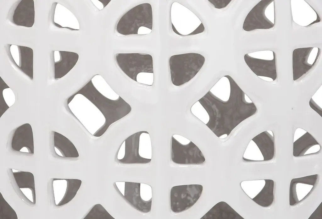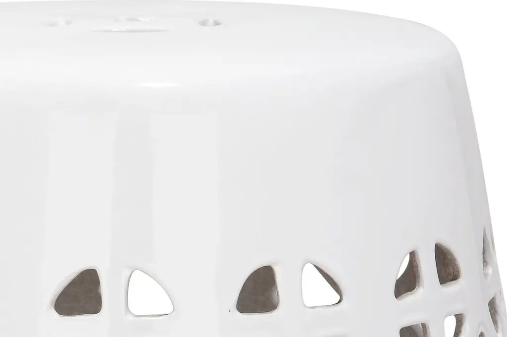 The always versatile garden stool, perfect for extra seating or a stylish side table, gets amped up with intricate, lacy piercing and a cool, white finish.