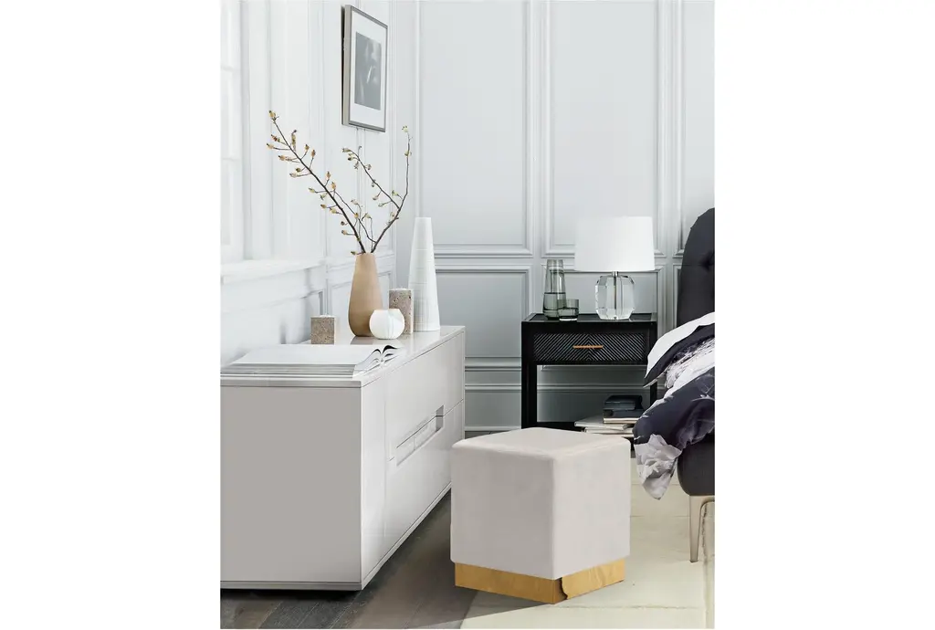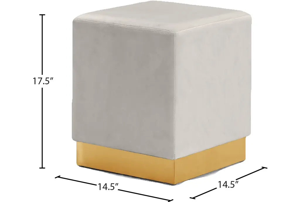 The Jax Cream Velvet Upholstered Rectangle Ottoman/Stool is a versatile addition to any living room or bedroom. Its soft cream velvet upholstery and rectangular shape provide both comfort and functionality. Gold detailing on the base adds a touch of modern sophistication.