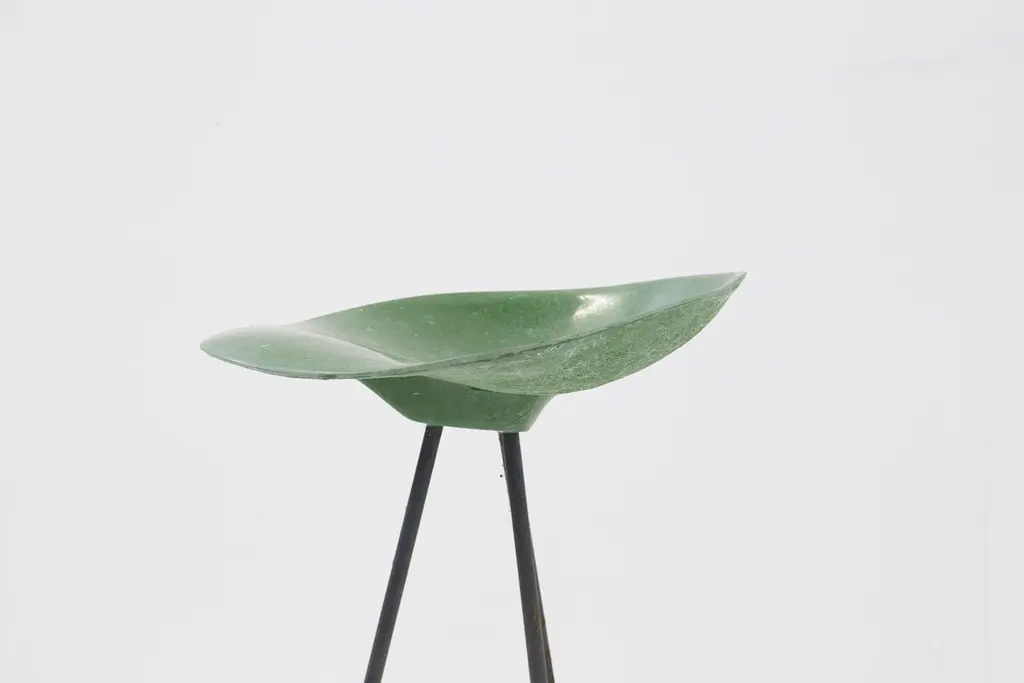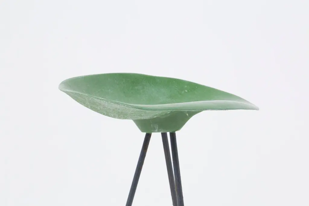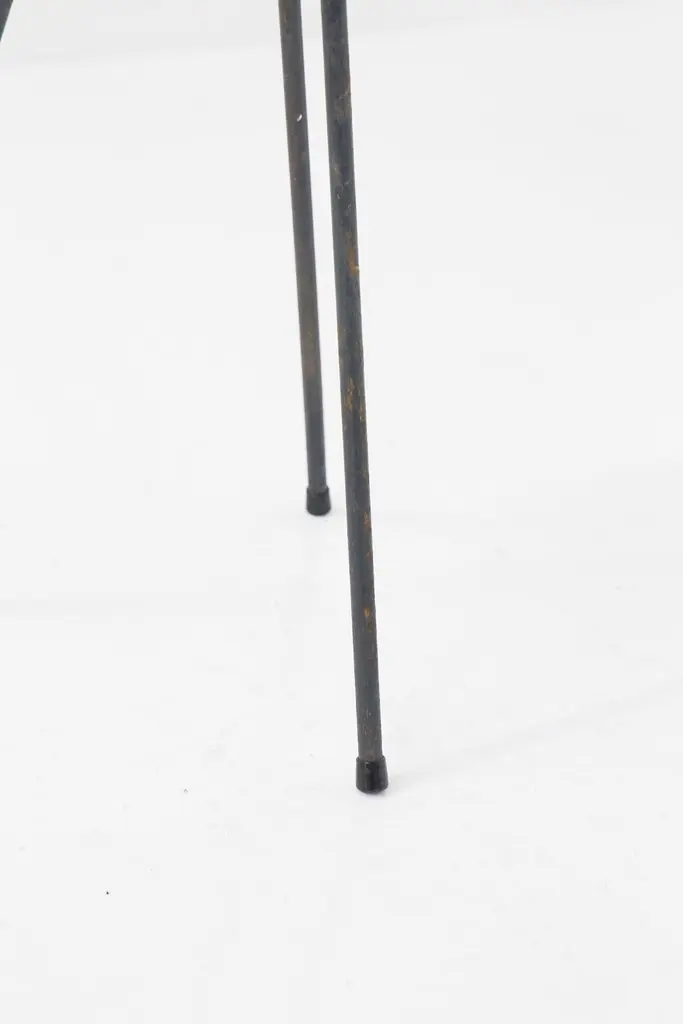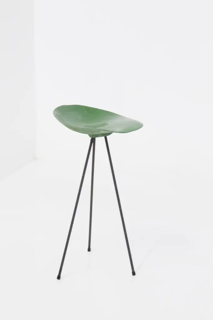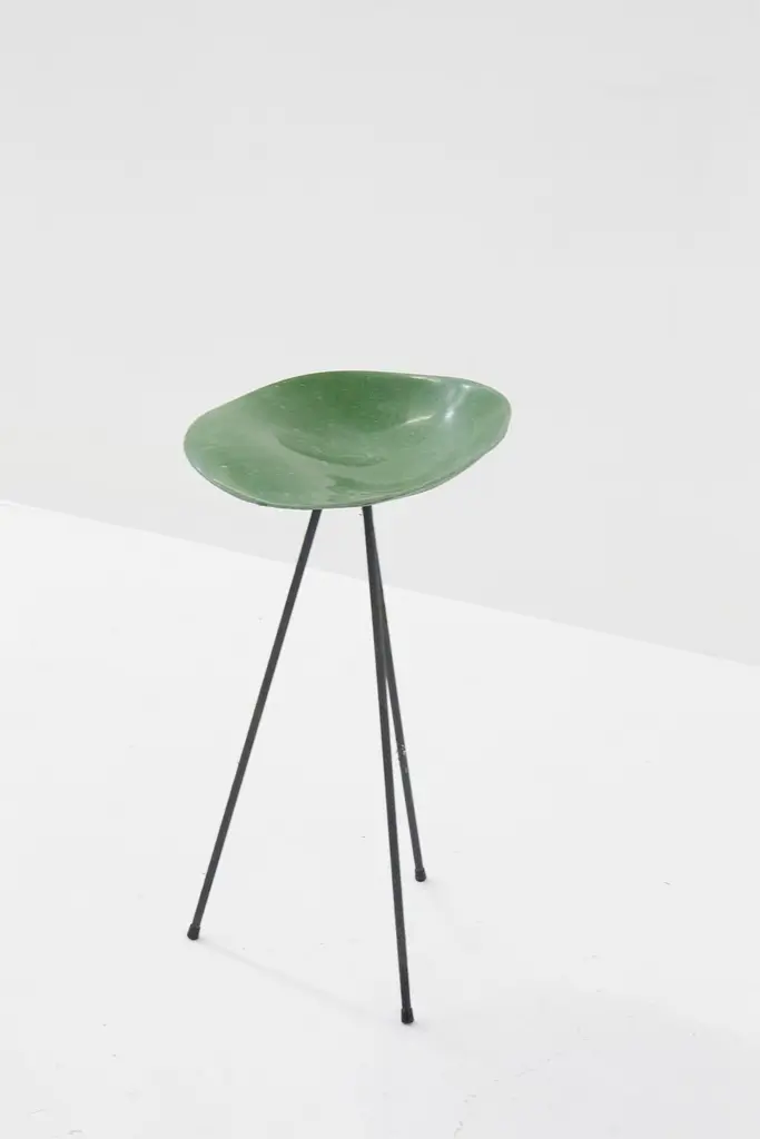 Tripod "tabouret" stool by Jean Raymond Picard, also the author of the first French green fiberglass chair of the 1950s. Both are known to have been produced by "SETA," a French interior design company of the time.The stool presents three iron legs in excellent patina and a very ergonomic seat that fits its host perfectly. The Stool presents with faded red fiberglass/parchment shell with visible fibers and excellent patina. The stool through its very midcentury French forms is ideal for design environments and modernist style.It shows wear and tear due to its age and use.