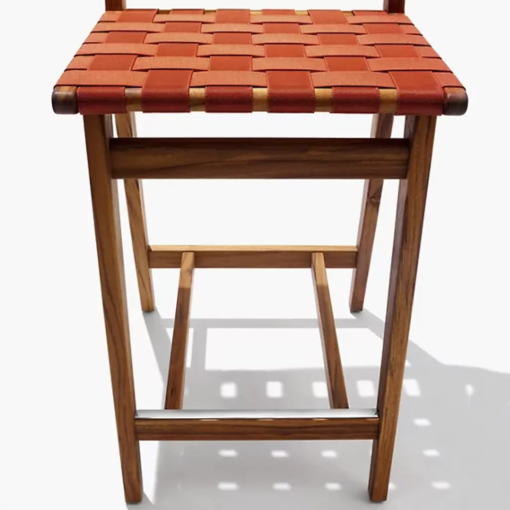 The Jens Risom Outdoor Stool from Knoll is a balance of form and function, designed in 1943 to fill a furniture shortage during wartime. Jens Risom created the piece under wartime material constraints. Risom believed that solution-based design was good design. He imagined this piece's back and seat rest originally out of parachute webbing. Today's technology substitute this material for a sunbrella fabric that's resistant to UV, fading, and stains. The sunbrella is hand-wrapped in a perpendicular weave for airy, soft support. This material contrasts beautifully with the warm hues of the teak wood structure. The teak features precise angles for a balanced, restful seat.