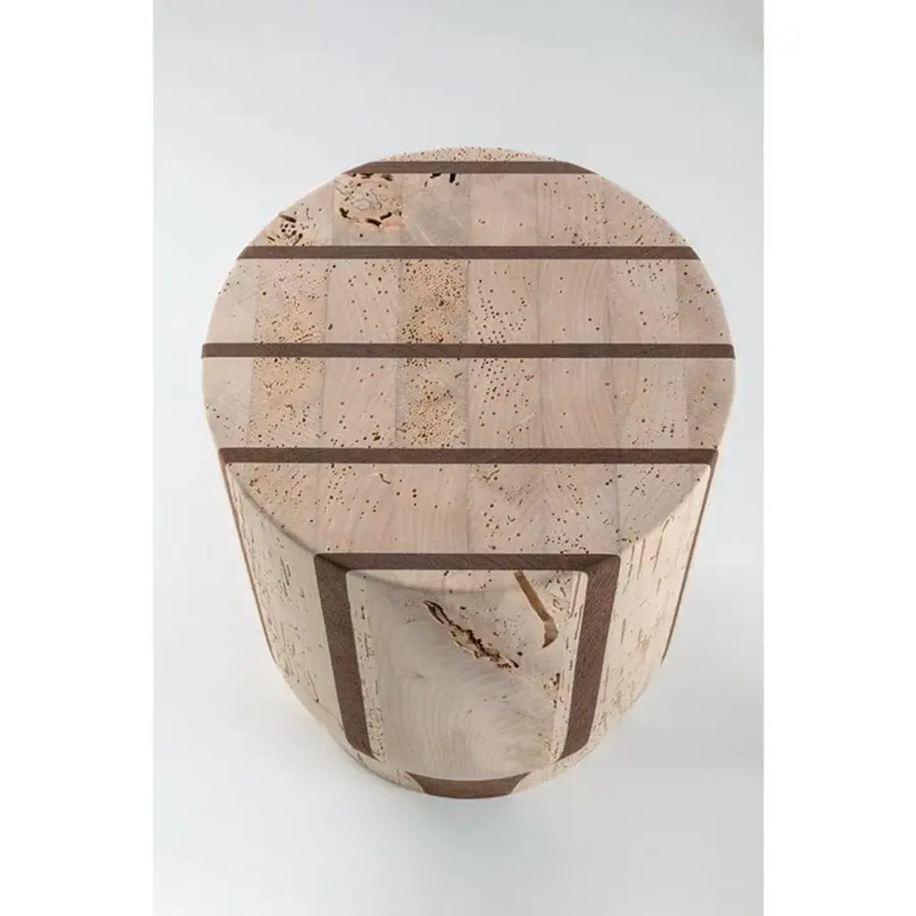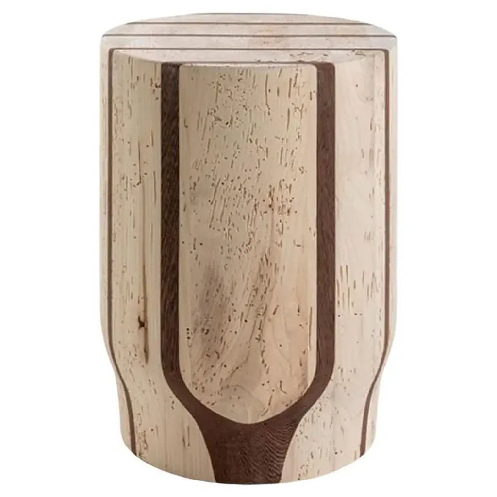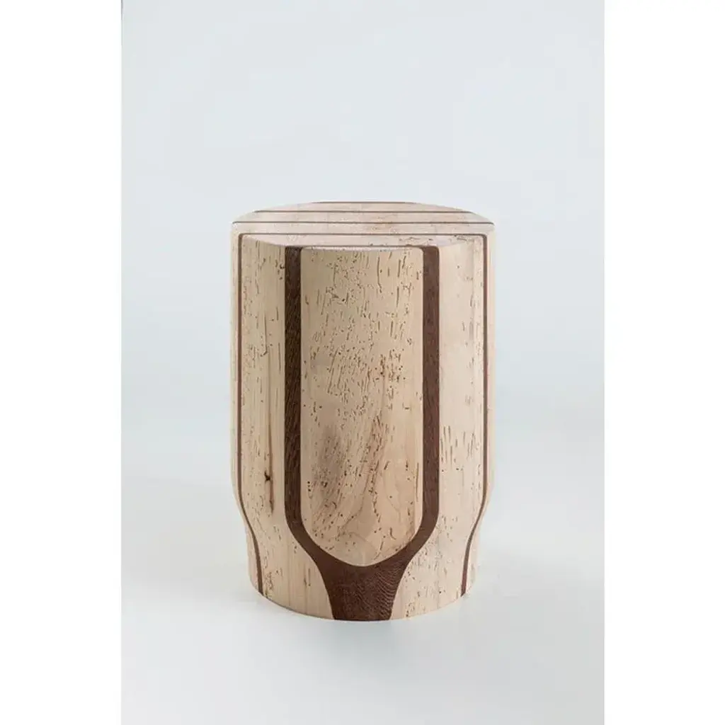 Jeunesse wengè stool by secondome edizioni and studio f designer: duccio maria gambi. dimensions: ø 32 x h 43 cm. Materials: solid woodworm maple wood and wengè wood. Collection / production: secondome + studio f. available finishes: all kinds of solid wood. Available colors: wengè and wood can be swapped. the collection is composed of three works that explore the relationship between two elements, a solid mass of reclaimed wood, with its imperfect and discontinuous material, and finely worked layers of compact wood that recreate geometries through their interweaving colour, that alter the original volume of the matter.