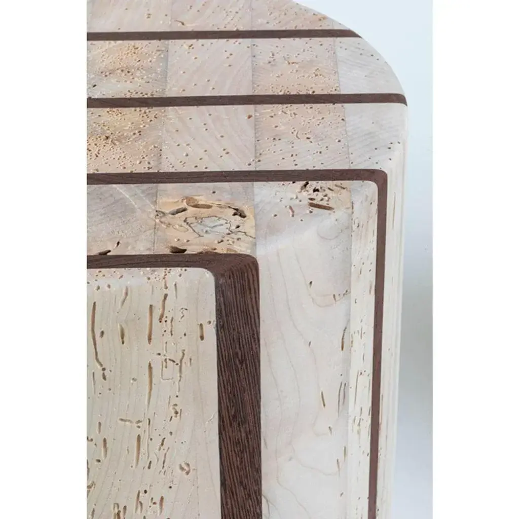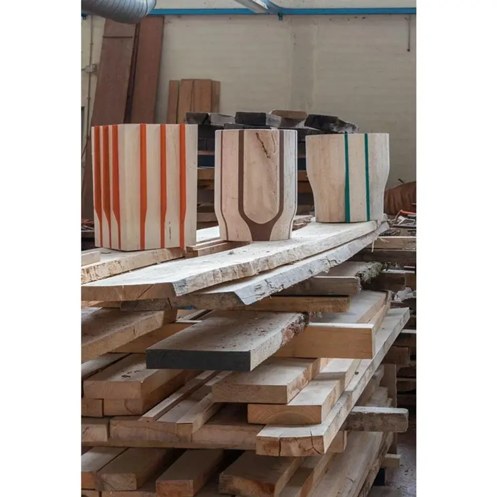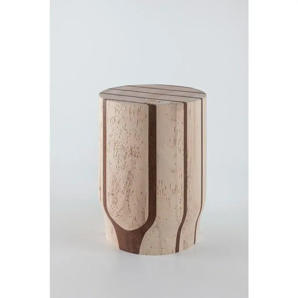 Jeunesse wengè stool by secondome edizioni and studio f designer: duccio maria gambi. dimensions: ø 32 x h 43 cm. Materials: solid woodworm maple wood and wengè wood. Collection / production: secondome + studio f. available finishes: all kinds of solid wood. Available colors: wengè and wood can be swapped. the collection is composed of three works that explore the relationship between two elements, a solid mass of reclaimed wood, with its imperfect and discontinuous material, and finely worked layers of compact wood that recreate geometries through their interweaving colour, that alter the original volume of the matter.