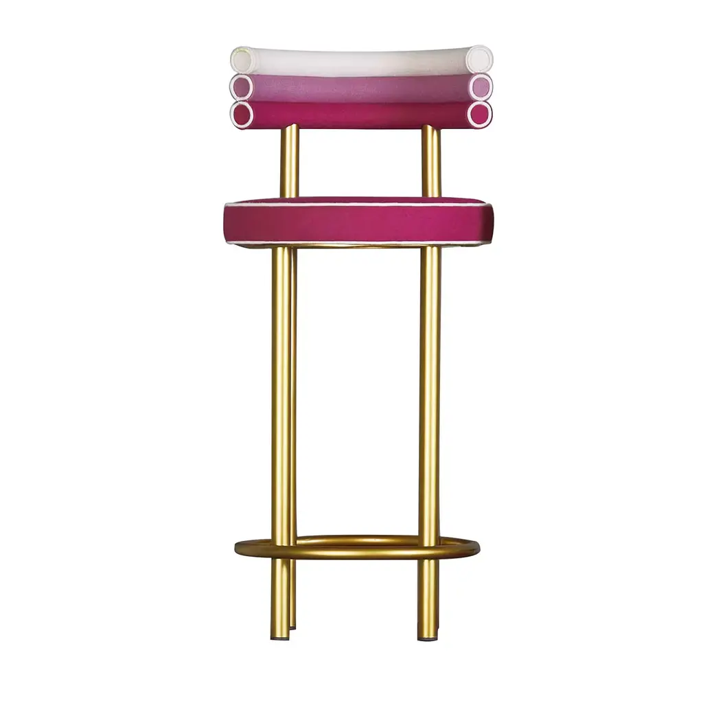 Drawing inspiration from '50s designs, this exclusive stool captures the eye with its bold volumes entirely traced by captivating curves. The three piled curved tubes making up the backrest are its distinctive feature. Their fresh blu-toned fabric upholstery is also shared by the 65cm-high padded seat. A warm golden sheen further enriches its design thanks to the streamlined metal legs surrounded by a coordinated ring-shaped footrest. Additional fabrics and finishes are available upon request. Contact the concierge for more details.