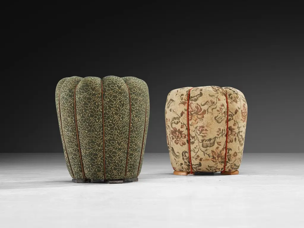 Jindrich Halabala for UP Závody, footstools, tabourets, ottomans, fabric, beech, Czech Republic, 1930s.This poetic pouf, designed in the 1930s at the height of the Art Deco movement, stands out for its artistic upholstery, which still retains its original fabric, and its intriguing construction. Halabala crafted a harmonious piece that beautifully balances soft colors with bold, geometric forms. Beyond its visual appeal, the pouf is also highly functional - it can serve both as an ottoman for your lounge chair or as a standalone stool. The design exemplifies Halabala’s signature aesthetic and thoughtful use of materials.Kindly note that the sizes of these items vary. The price listed is per item.