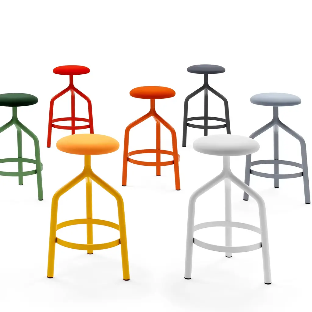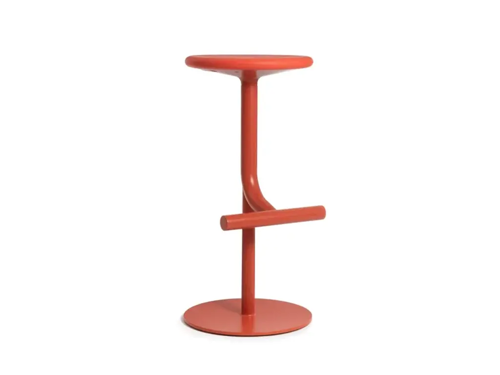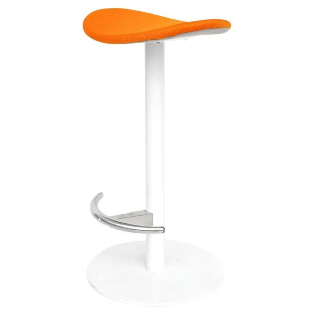 JOE, a family of steel stools with a contemporary design and industrial feel. Joe is the fixed version, with an elegant three-way die-cast aluminum joint. The base, painted in the metallic finishes of the Viganò color palette, features the typical round seat and brings a touch of sophistication to breakfasts, lunches and dinners. Stool with a padded seat, steel-tube frame diameter 35 cm, orange finish. Upholstered in orange flame-resistant fabric.