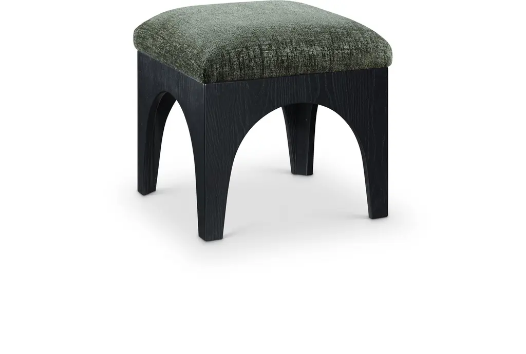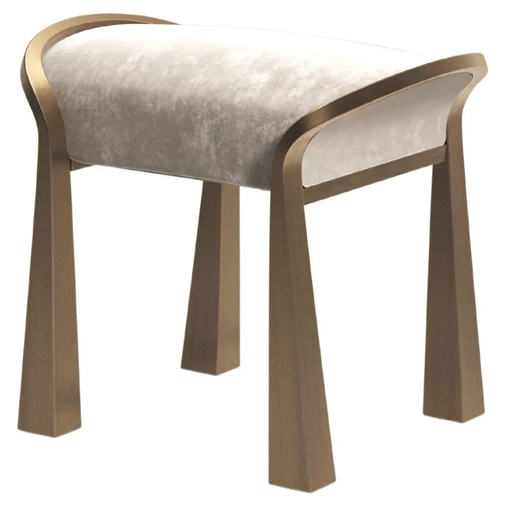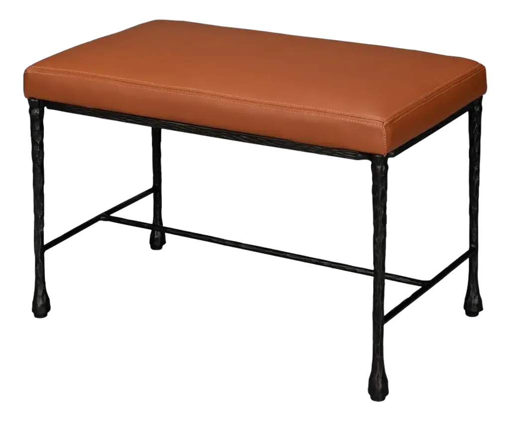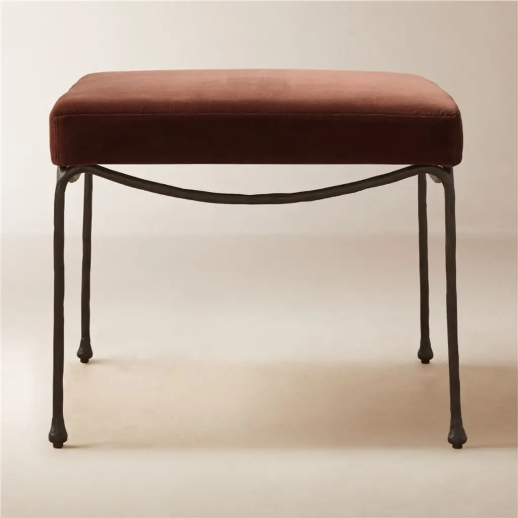 Designed by NYC-based Brett Beldock, velvet stool recalls sculptural art deco designs. The matte black metal base features decorative swags that gracefully drape from one leg to the other. Upholstered in a rust-colored velvet, the spare silhouette lends itself to use in multiples as a bench in front of the bed. CB2 exclusive.