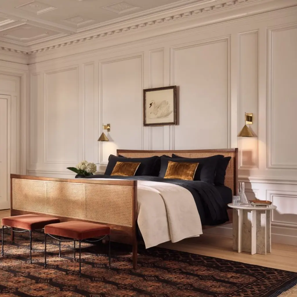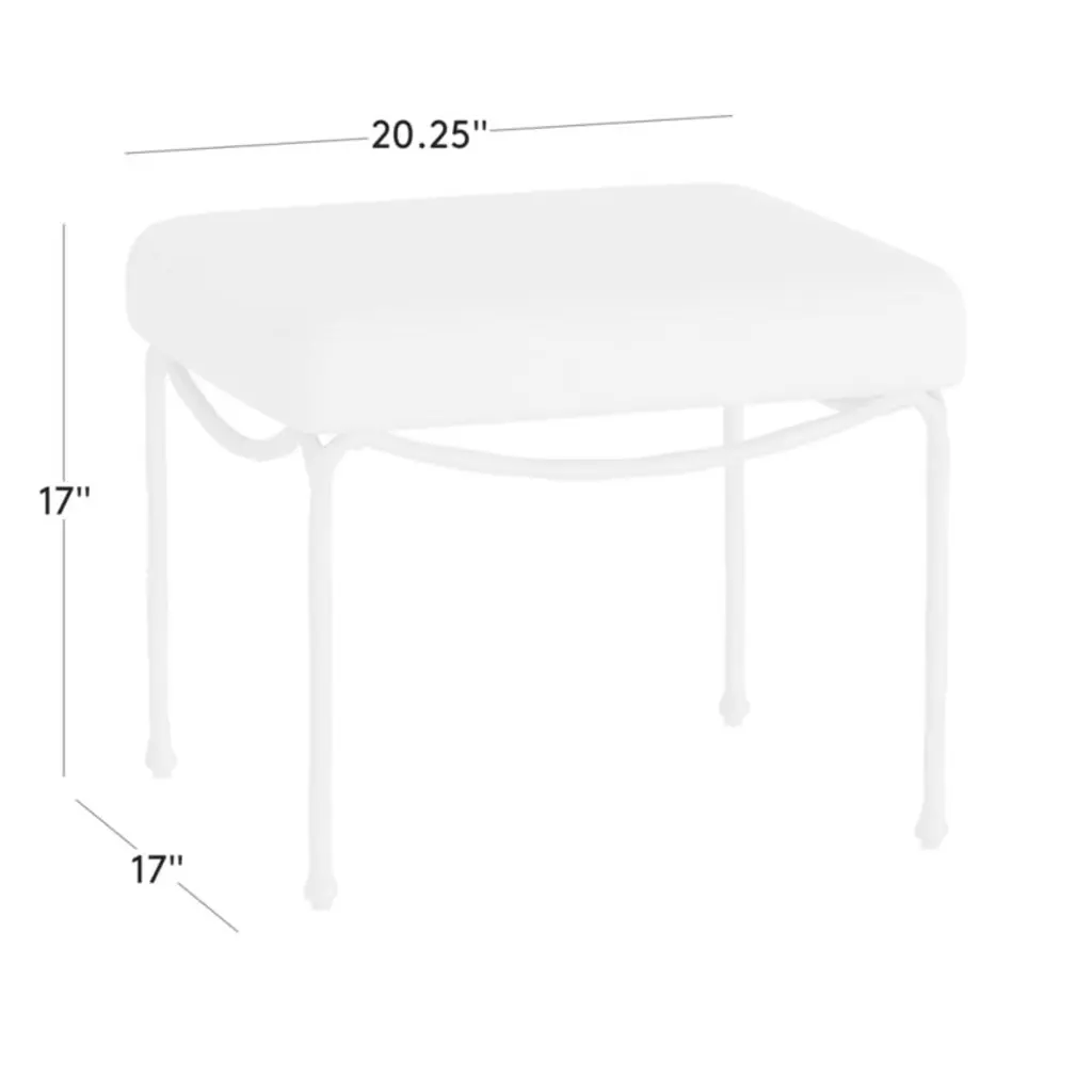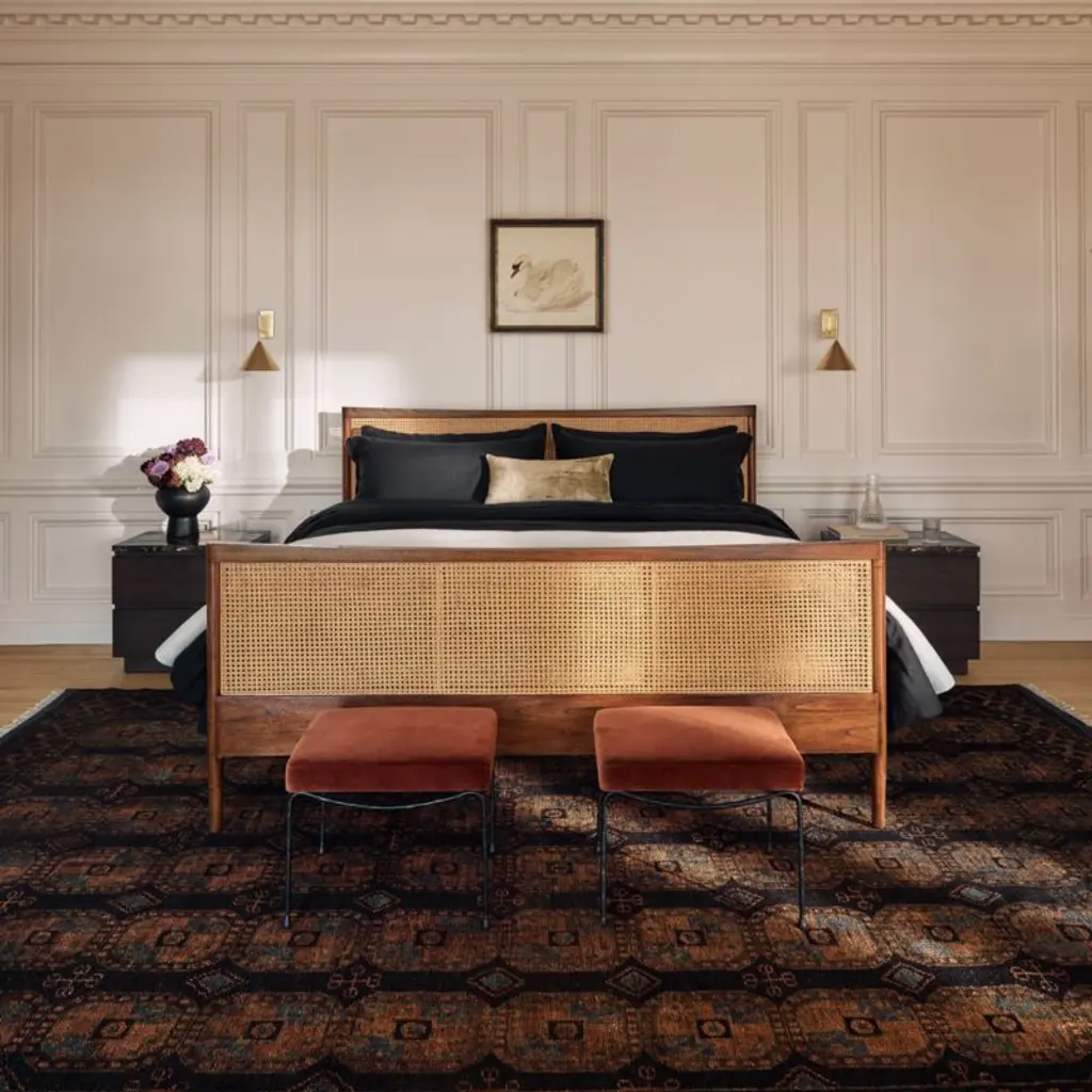 Designed by NYC-based Brett Beldock, velvet stool recalls sculptural art deco designs. The matte black metal base features decorative swags that gracefully drape from one leg to the other. Upholstered in a rust-colored velvet, the spare silhouette lends itself to use in multiples as a bench in front of the bed. CB2 exclusive.