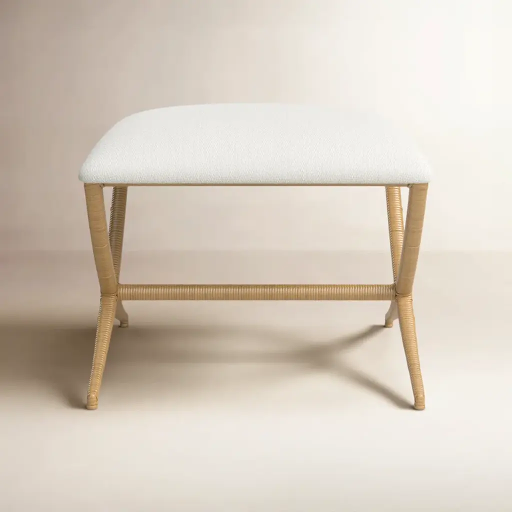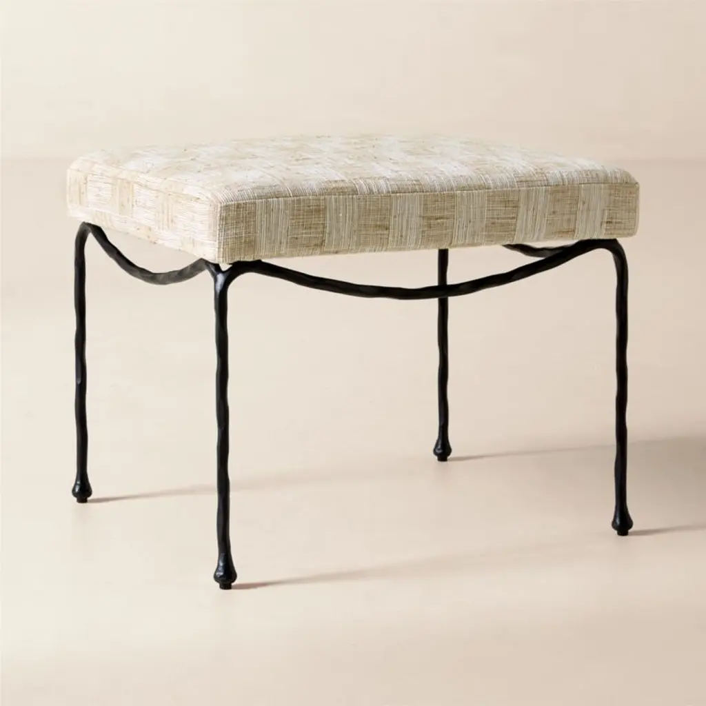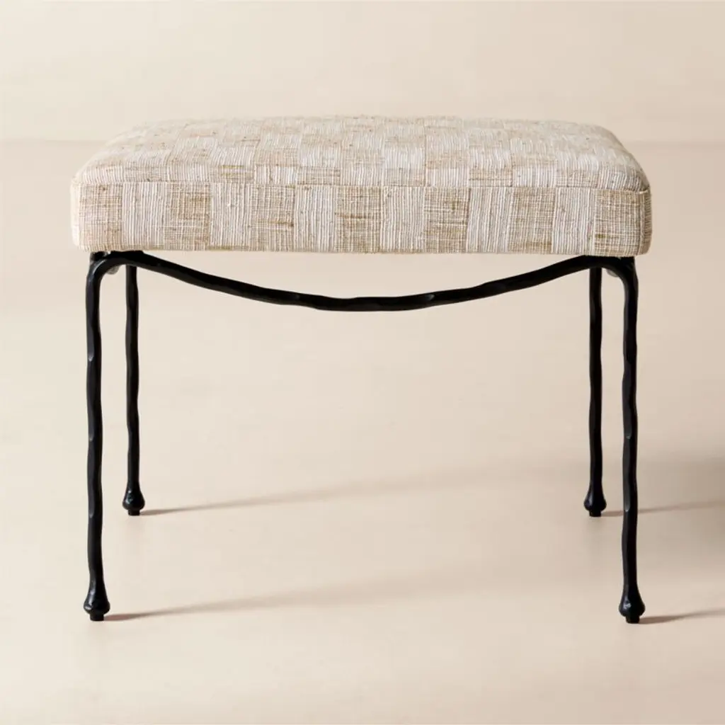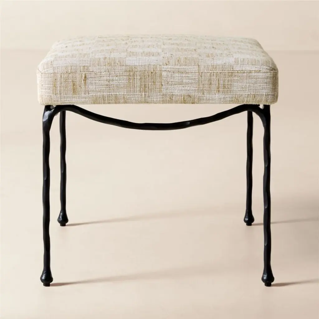 Designed by NYC-based Brett Beldock, upholstered stool recalls sculptural art deco designs. The matte black metal base features decorative swags that gracefully drape from one leg to the next. Upholstered in a white and light brown checked fabric woven in India, the spare silhouette lends itself to use in the entryway or bedroom. CB2 exclusive.