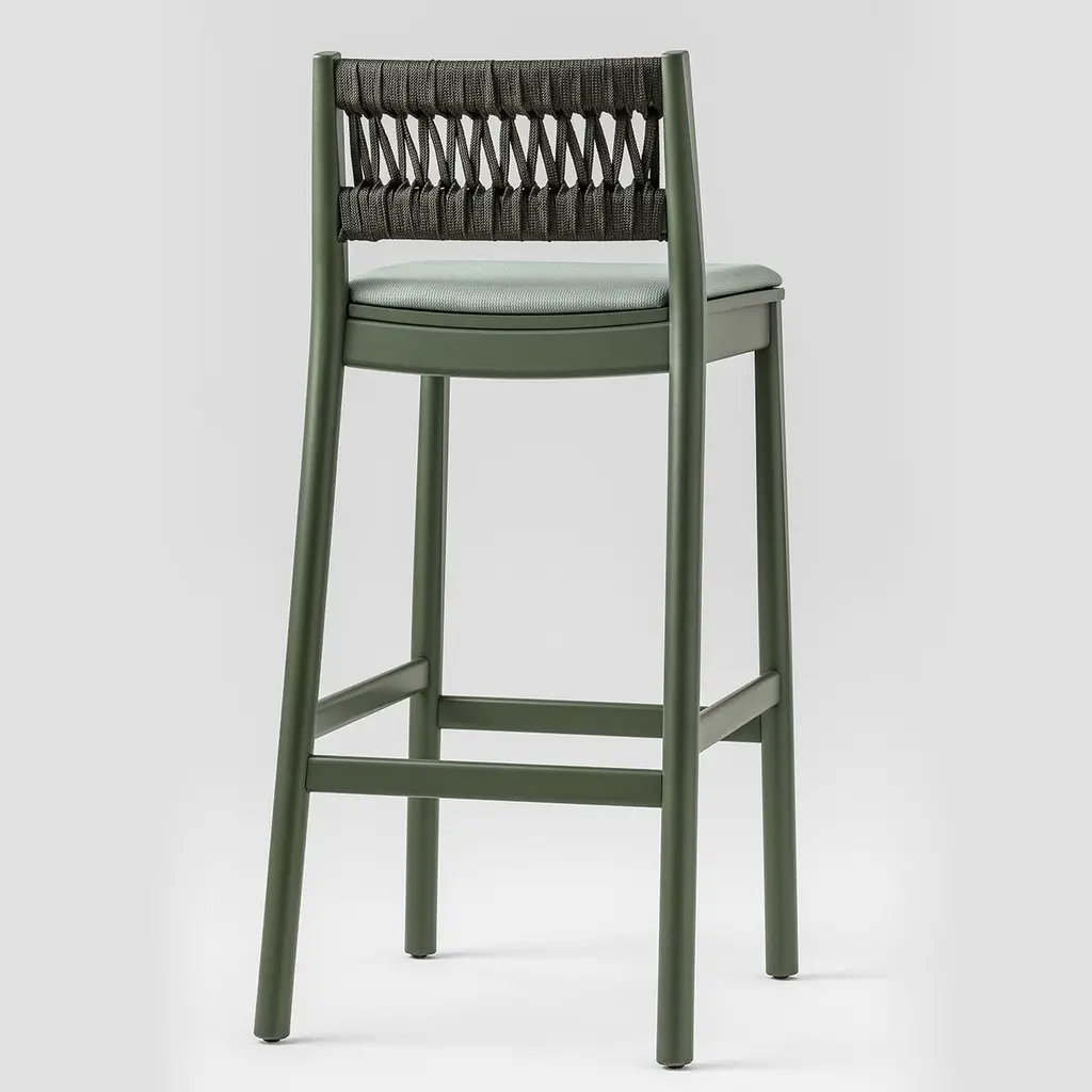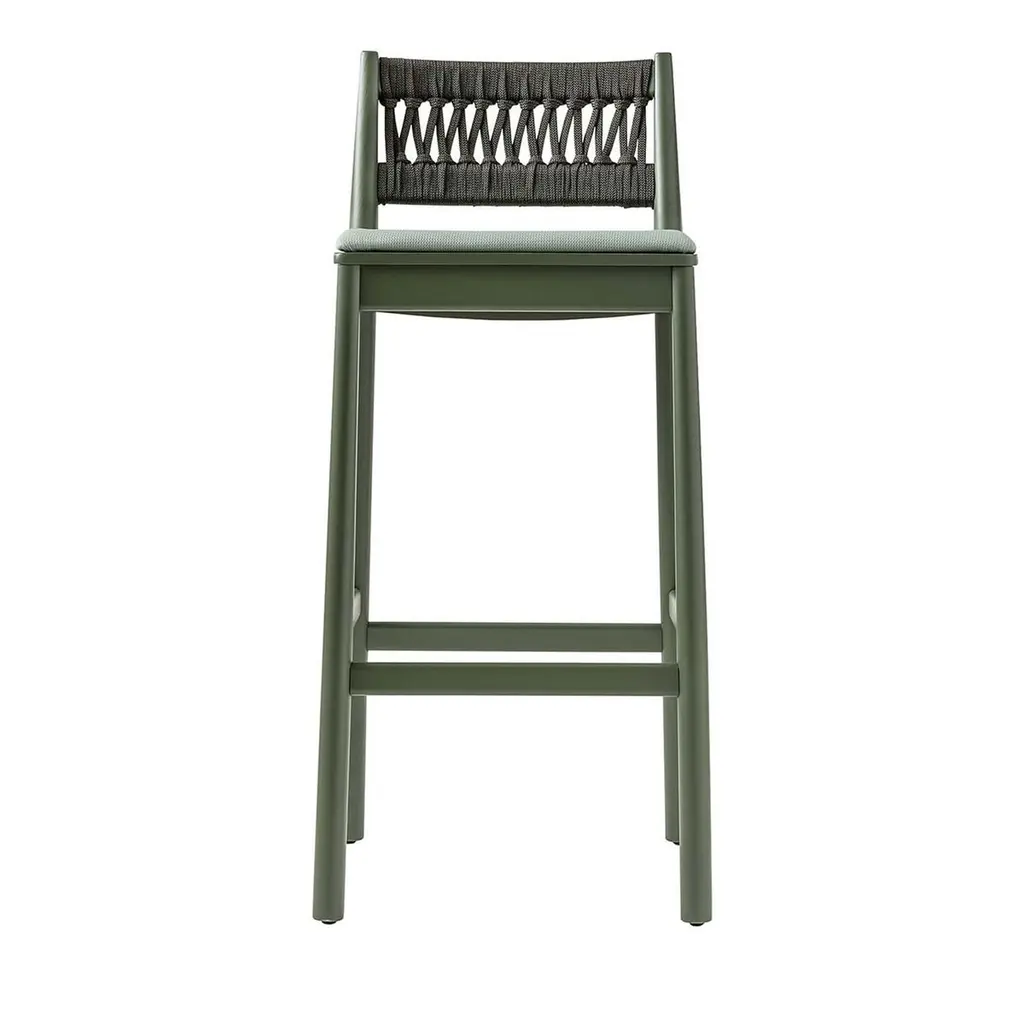 Enlivening a modern, rustic-chic interior of both private or contract nature with its bold green hue and striking design, this stool by Emilio Nanni reinterprets the archetypical concept of chair in a contemporary key. Handcrafted of wood, it features a fabric upholstered seat and a refined backrest decorated with a striking rope motif. Please ask the Concierge for customizations.