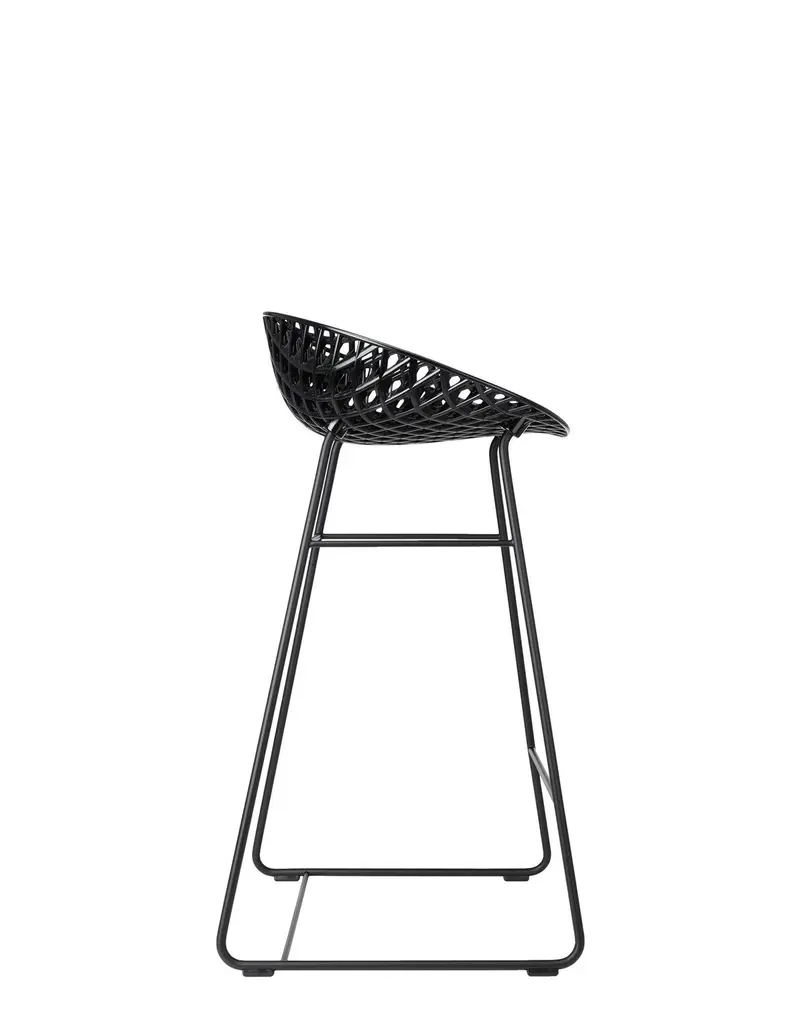 The Smatrik stool joins the family of seats created by Tokujin Yoshioka and is crafted using a mould which enables the recreation of a 3D net that overlaps and crosses over.Thanks to a special injection technology, the layers of transparent or mass-dyed polycarbonate create a structure moulded in a single piece, which simulates a metallic net, with a painted or chrome-plated structure, painted with stainless steel for the outdoor version.Available in crystal, white and black with different options.Available also for outdoor.