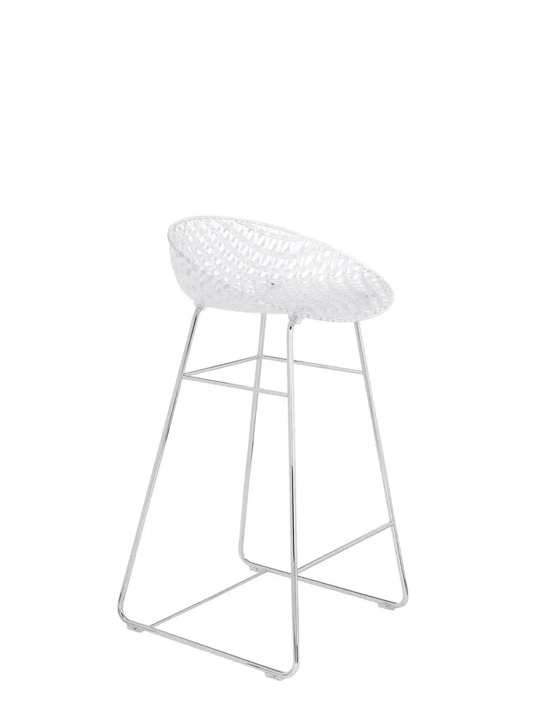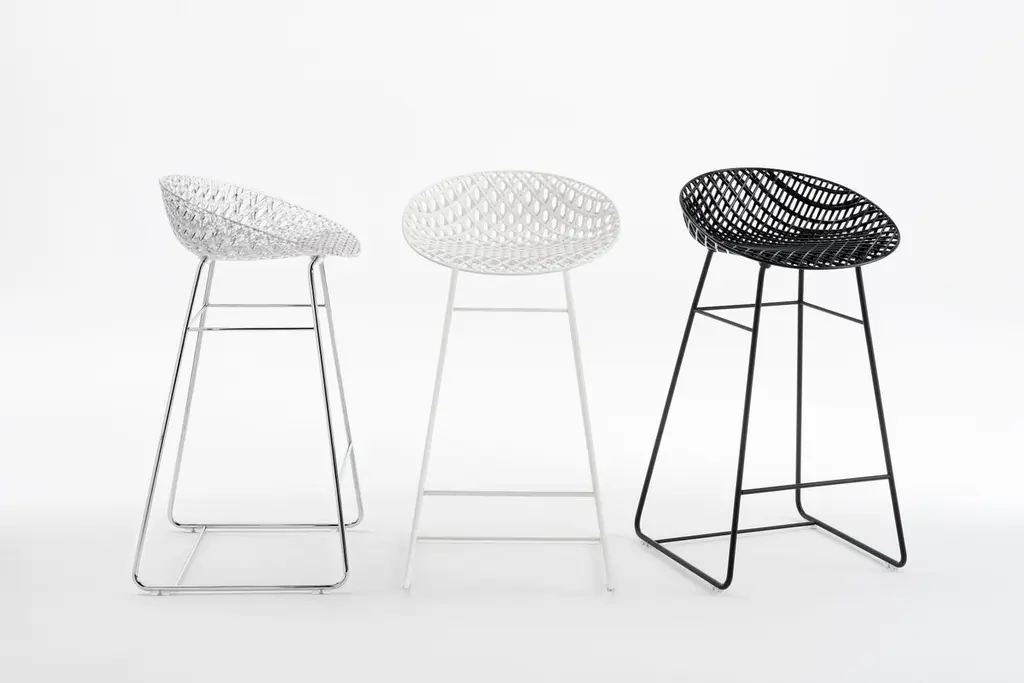 The Smatrik stool joins the family of seats created by Tokujin Yoshioka and is crafted using a mould which enables the recreation of a 3D net that overlaps and crosses over.Thanks to a special injection technology, the layers of transparent or mass-dyed polycarbonate create a structure moulded in a single piece, which simulates a metallic net, with a painted or chrome-plated structure, painted with stainless steel for the outdoor version.Available in crystal, white and black with different options.Available also for outdoor.