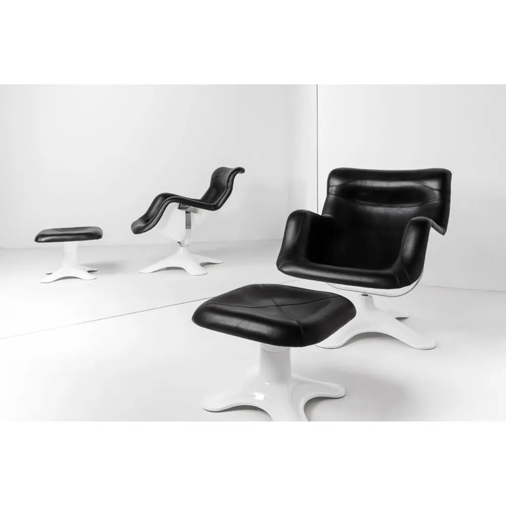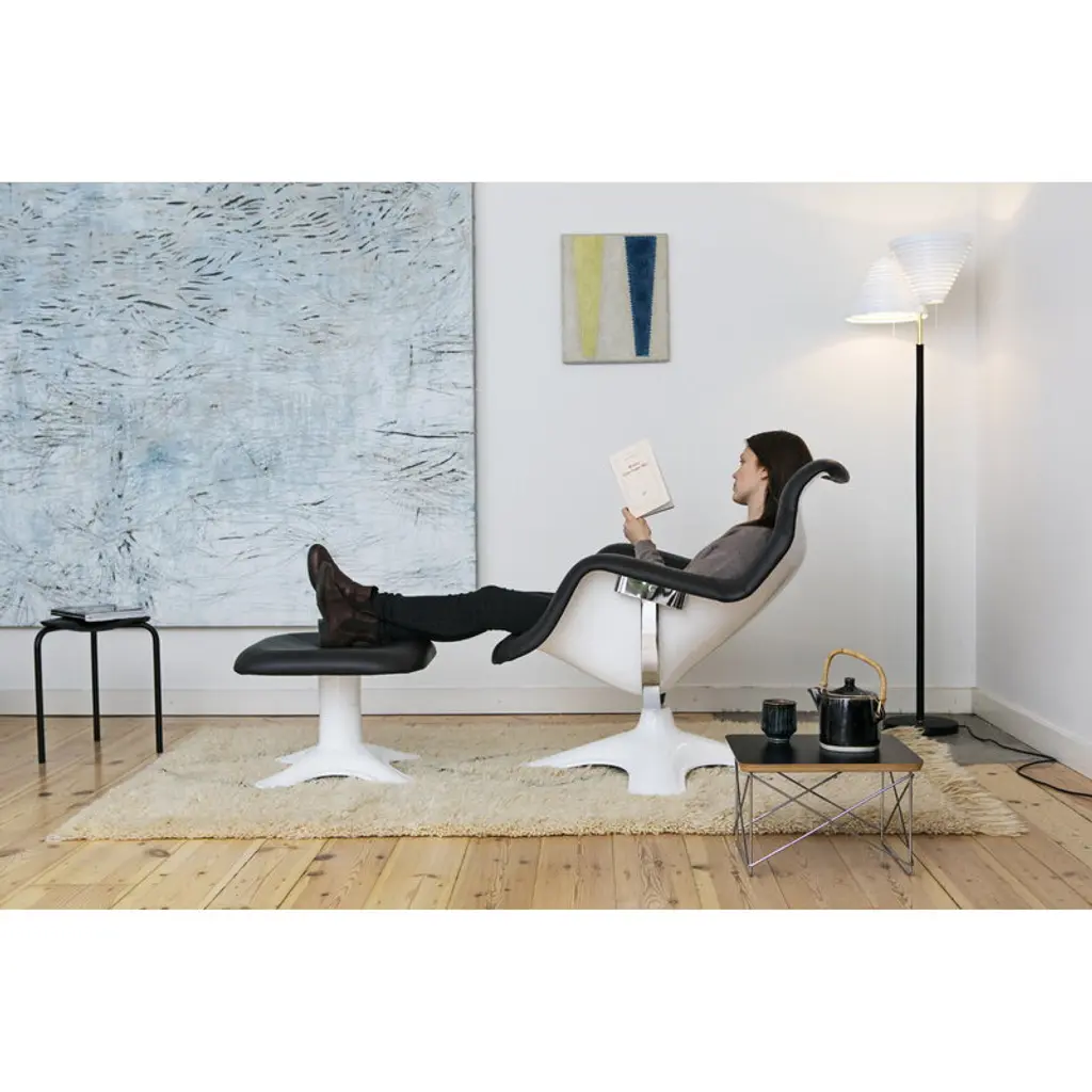 Foot stool for the Karuselli chair, designed by Yrjö Kukkapuro. Designed by Yrjö Kukkapuro, Karuselli is one of the most famous lounge chairs in the world. Kukkapuro began developing the fiberglass chair in the 1950s, arriving at the famous shape in 1964. The international launch of the chair took place at the Cologne Furniture Fair in 1965. The shape of the Karuselli chair is the result of extensive experimentation. Kukkapuro spent four years sculpting it – searching for the right dimensions, initially using his own body as a guide. Karuselli is exceptionally comfortable as well as stylistically distinctive precisely because it is ergonomically based on the shape and proportions of the human body. As a result of his persistent efforts, Kukkapuro finally accomplished a form that represented a novel combination of ergonomics, new materials and production methods, as well as artistic design. It was the combination of these qualities that made Karuselli a revolutionary chair of its time. Ever since its first launch, Karuselli has caught the eye, captured the imagination and has given pleasure to those sitting in it.