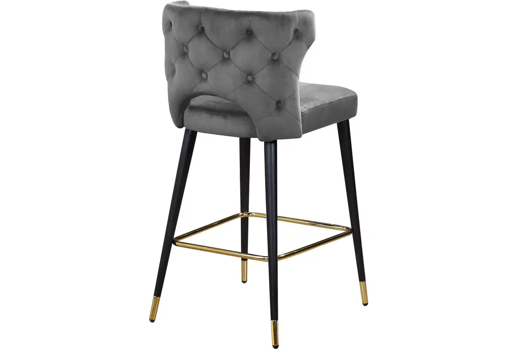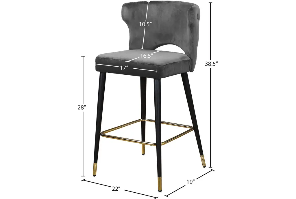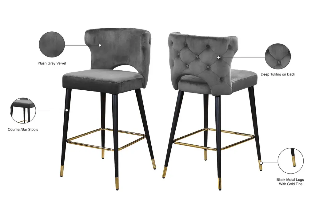 Enhance your dining room with the Kelly Grey Velvet Upholstered Stool Set of 2. These modern stools feature soft velvet upholstery and a sleek black and gold finish, adding a touch of sophistication to your space. The foam padding ensures comfort while the sturdy metal legs provide stability.
