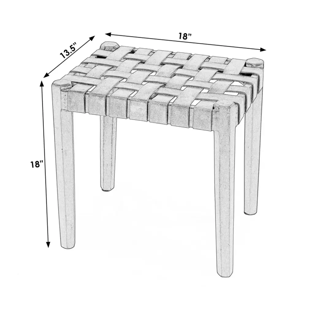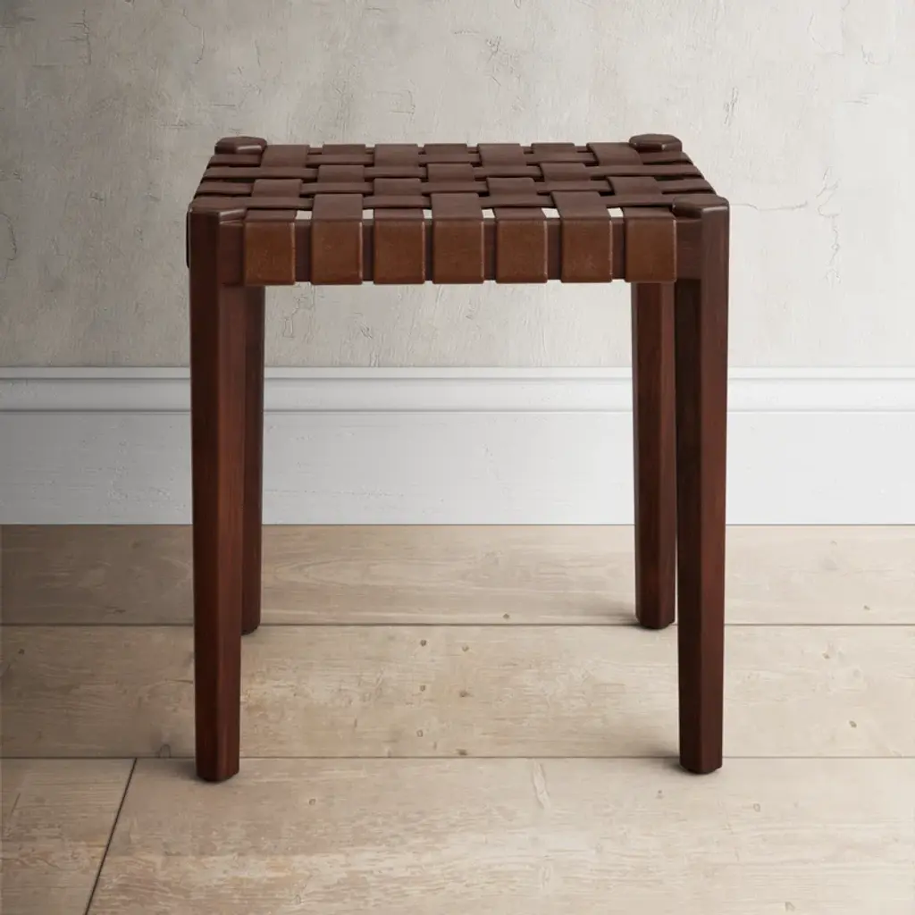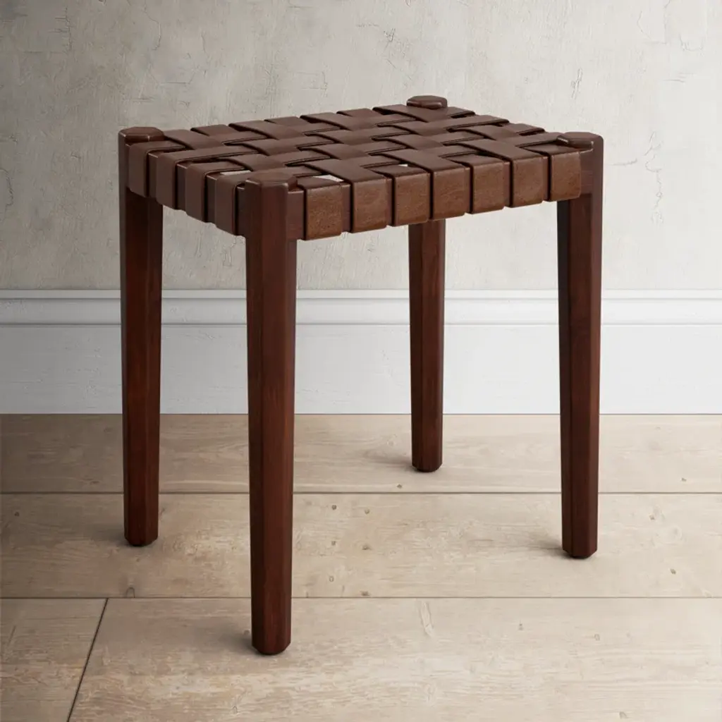 The rich brown wood pairs beautifully with the dark brown woven leather on this beautiful stool. Crafted from acacia wood and high-quality genuine leather, the Ken stool will only get better with time as the leather ages and turns to velvety leather while still maintaining its durable quality. You cant find a place where this stool doesn't fit in, whether you pair two under an open console to pull out when guests are over, center in front of a fireplace, or add two to the end of your bed.