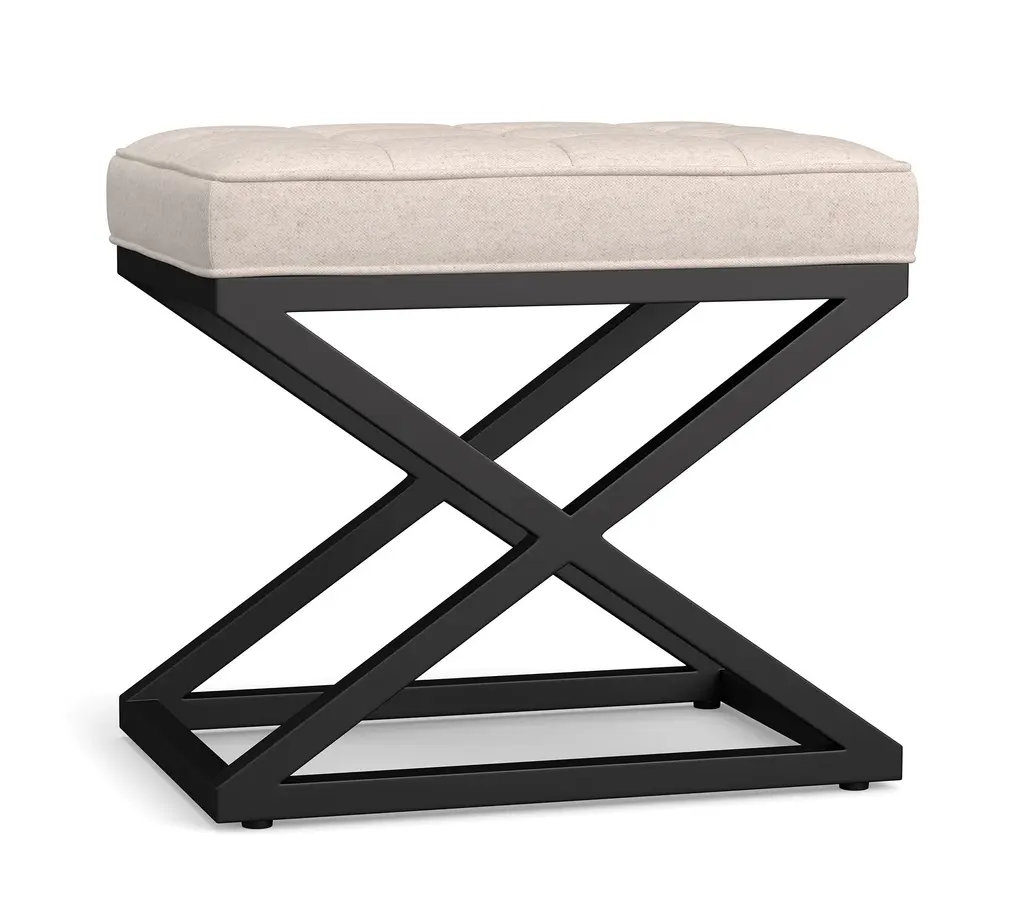 Our Kirkham Upholstered Stool features deep tufting and piping along the edges. The sleek bronze-finished base adds a contemporary look. Add this accent piece to any room for extra seating or use it as an end table.