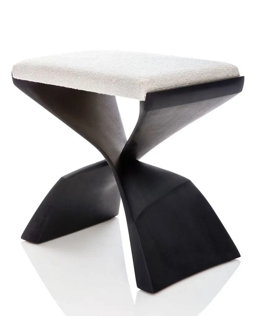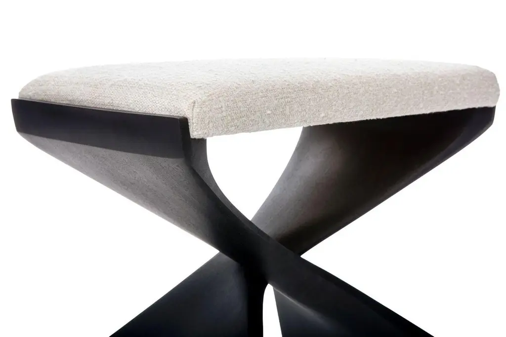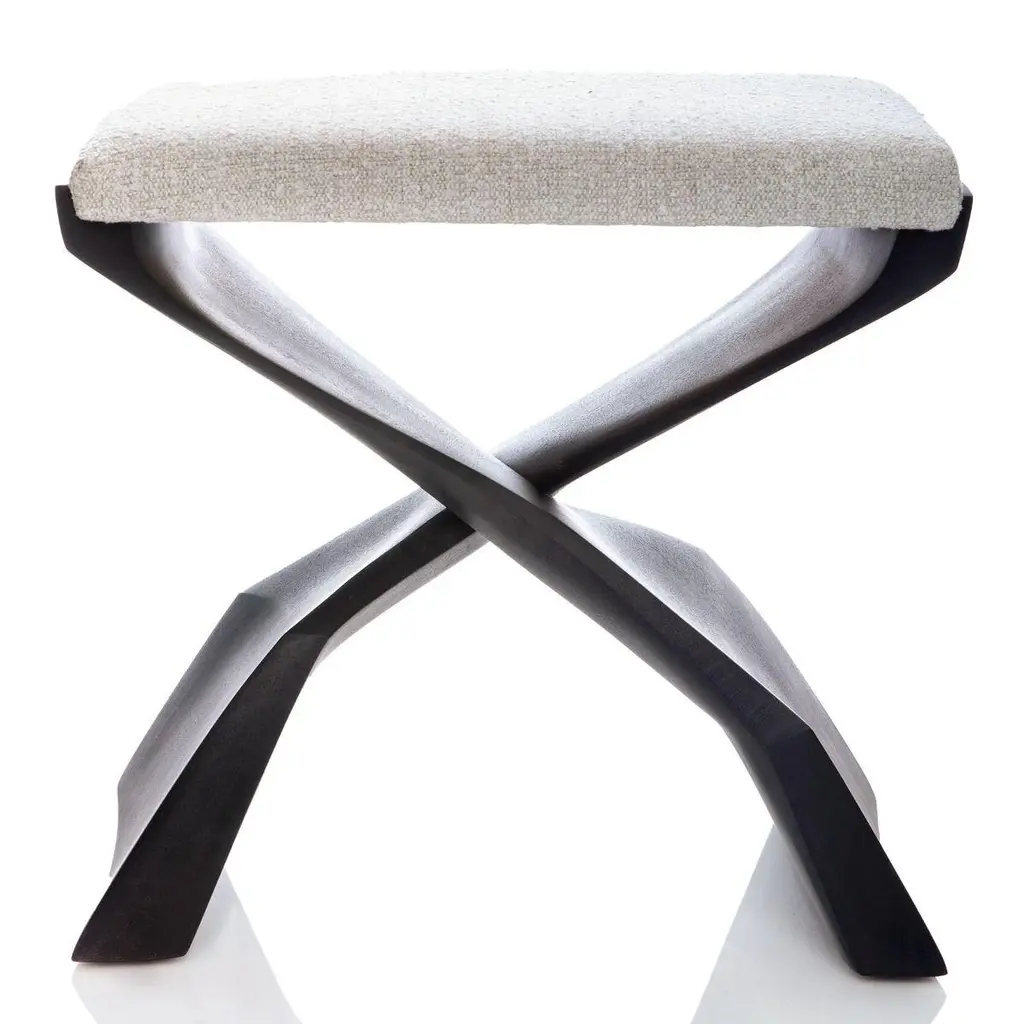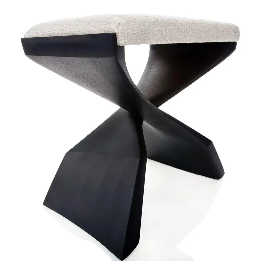 The name “evolution” suggests an elemental, primitive concept: a simple beginning for more complex ideas that evolve from it. The two legs of this piece are identical, held together with a simple notched joint. Their sculptural shape could be a fin or the webbed foot of some prehistoric creature. The basic “X” design is about as old as the art of furniture making and has been elaborated on and embellished for millennia. Its inherent beauty is firmly embedded in the designers’ human aesthetic hard drive.DIMENSIONSGrande: 22" W x 15" D x 20" HMATERIALSSapele wood, muslin-wrapped cushionWOOD FINISHWood Tone, Cerused, Ebonized, AmberWOOD TONELight, Dark, WarmUPHOLSTERYMuslin-wrapped cushionShown in Ivory Shag fabric: $150 per Standard stool, $250 per Grande stoolUPHOLSTERY SERVICE$250 per Standard stool, $350 per Grande stoolCOM3 yard per stool
