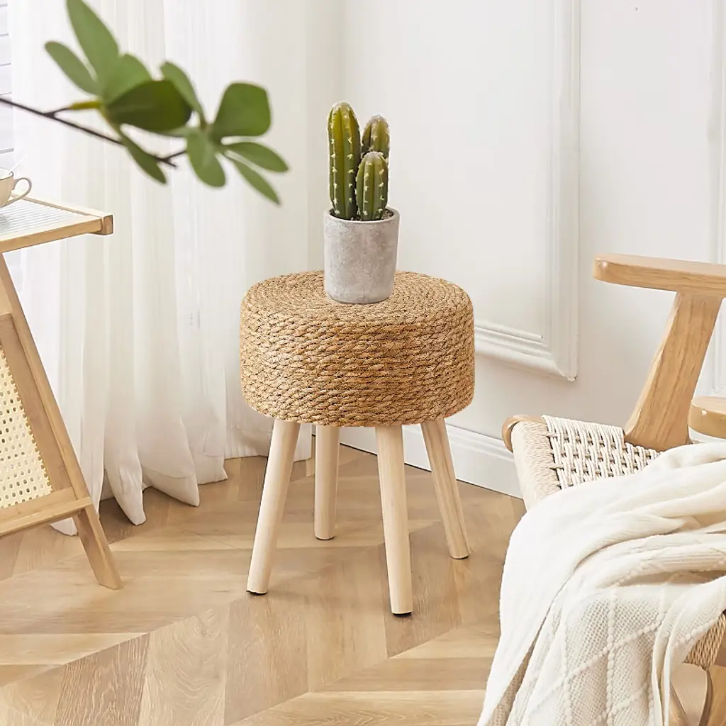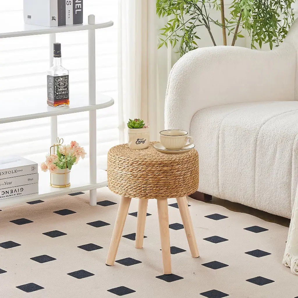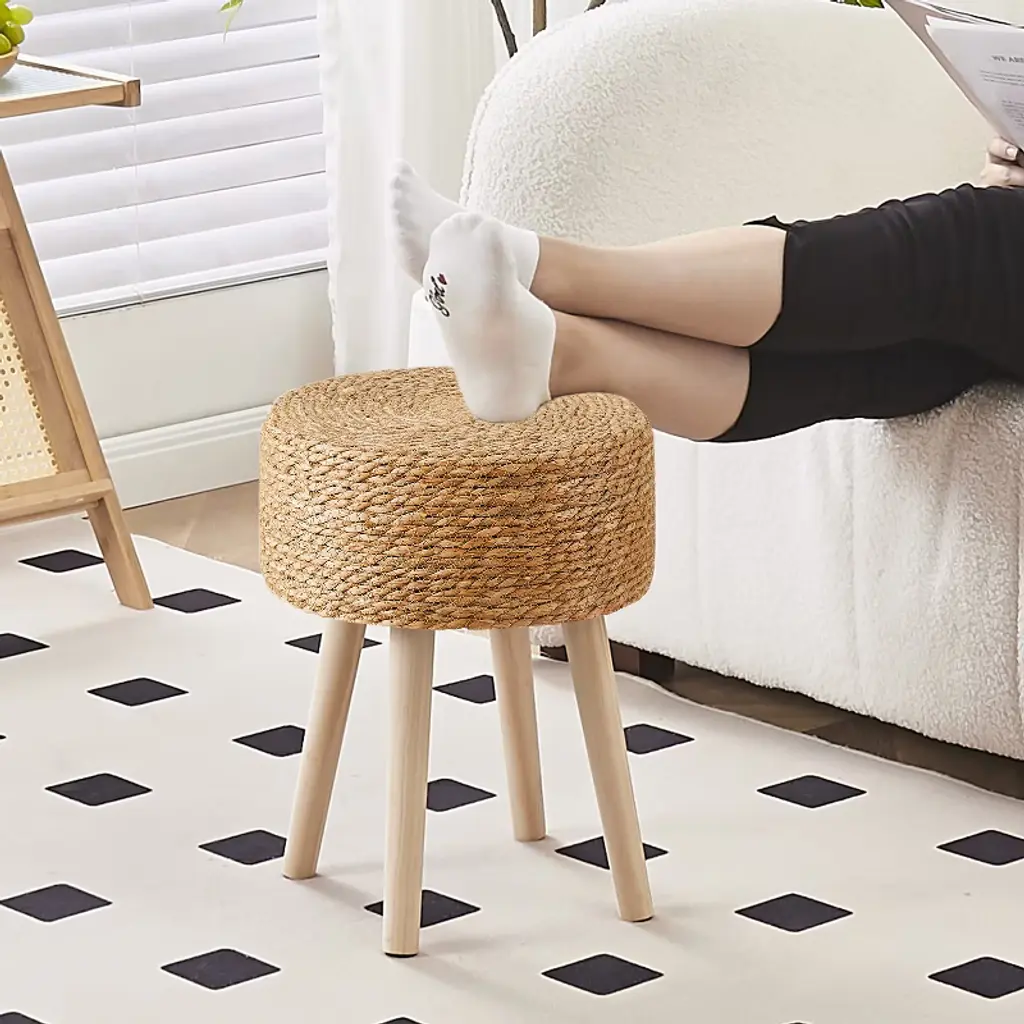 Cushion fabric is made of natural seagrass and water hyacinth,hand-woven by factory's old craftsmen,the ancient craftsmanship are recorded on each stool,worthy of every person's love and possession.Not only can be used as a footrest stool relaxing your foot,a soft seat matched with desk,a vanity stool,a step stool,but also can be used as a decro for your patio,a tray on which can lay small flower and others.