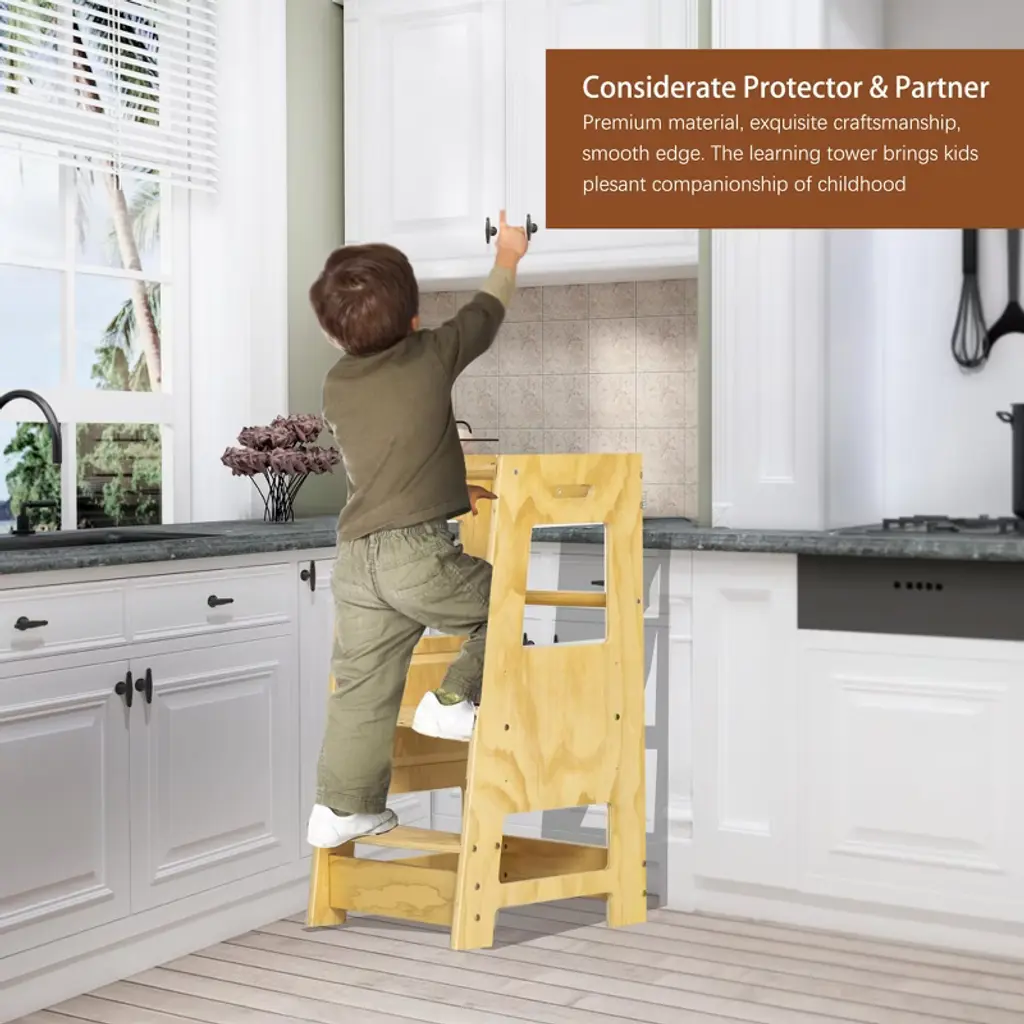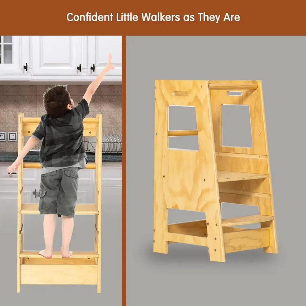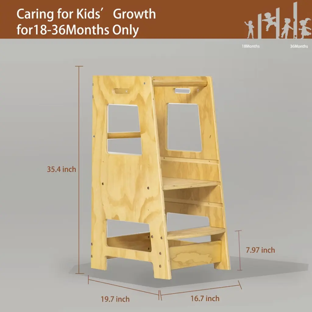 Our Step stools are designed for different ages of kids, and the wooden standing board can be adjusted to 3 different heights for kids. Three adjustable sizes - 11.8*15.7*19.6 in, give kids the support they need as they grow, and you can adjust the size that works best for their height. 2 levels adjustable crossbar with rings can meet the needs of children sitting and standing