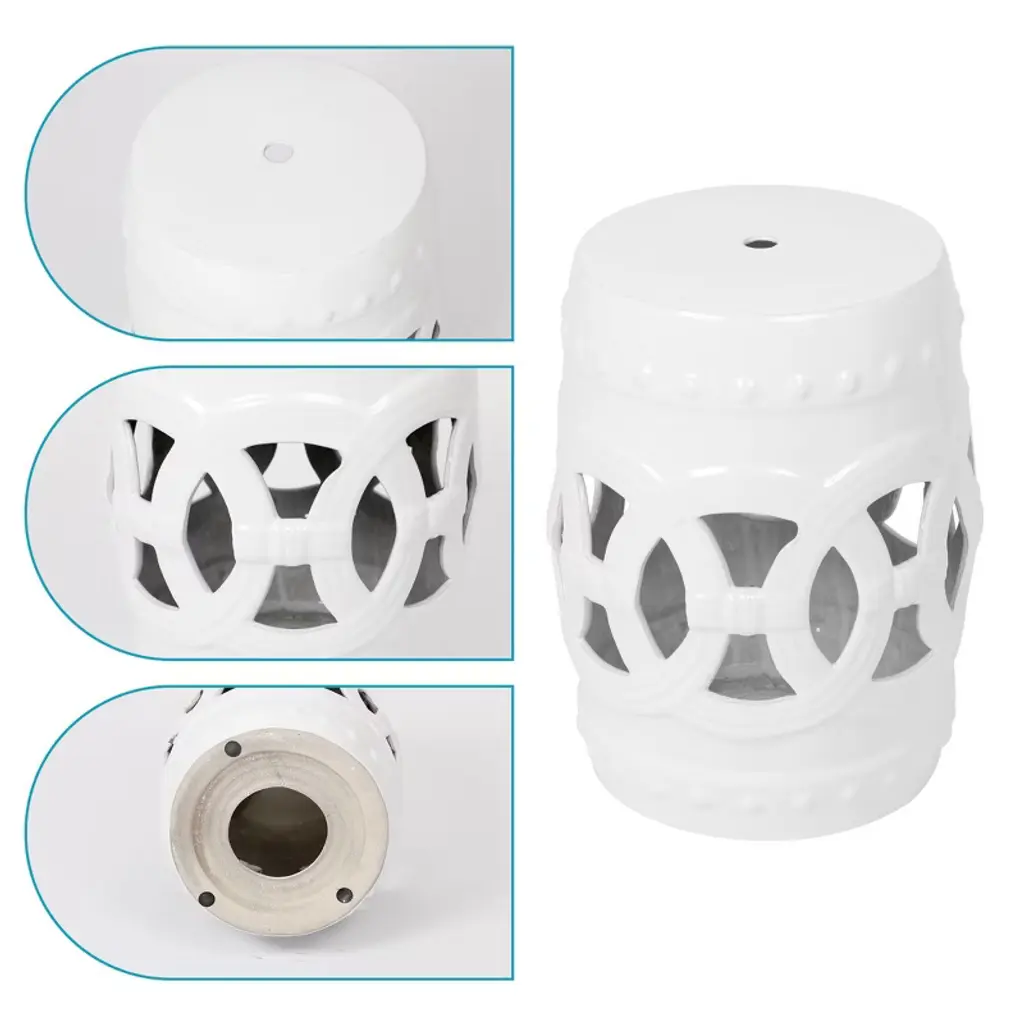 Kumasinova 17" Glazed Ceramic Drum Stool Outdoor End Table With 250lbs Max,versatile Decor Piece,accent Side Table With Hollow Carved Silhouette,white