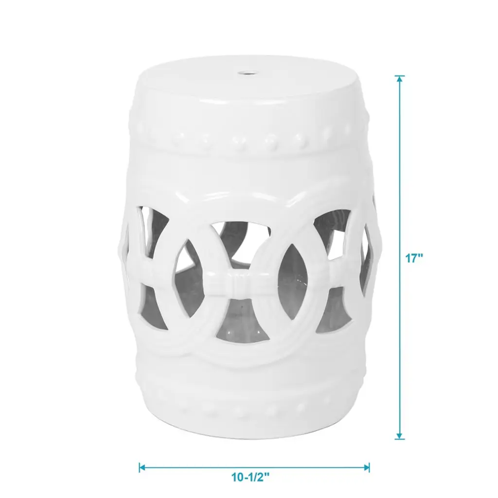 The Kumasinova 17" Glazed Ceramic Drum Stool is the perfect blend of elegance and versatility. Constructed from high-quality ceramic, this stool boasts a timeless white finish, offering both a classic and sophisticated look. The hollow and cutwork design not only adds artistic flair but also ensures easy portability. Durable and resistant to fading, it is designed for long-lasting beauty. This multi-functional piece can serve as a stylish side table, flower stand, or extra seating, making it a versatile addition to your indoor or outdoor space, from patios to living rooms.Dimensions: 10.5 in. (W) x 17 in. (L)Max Weight Capacity: 250 lbs