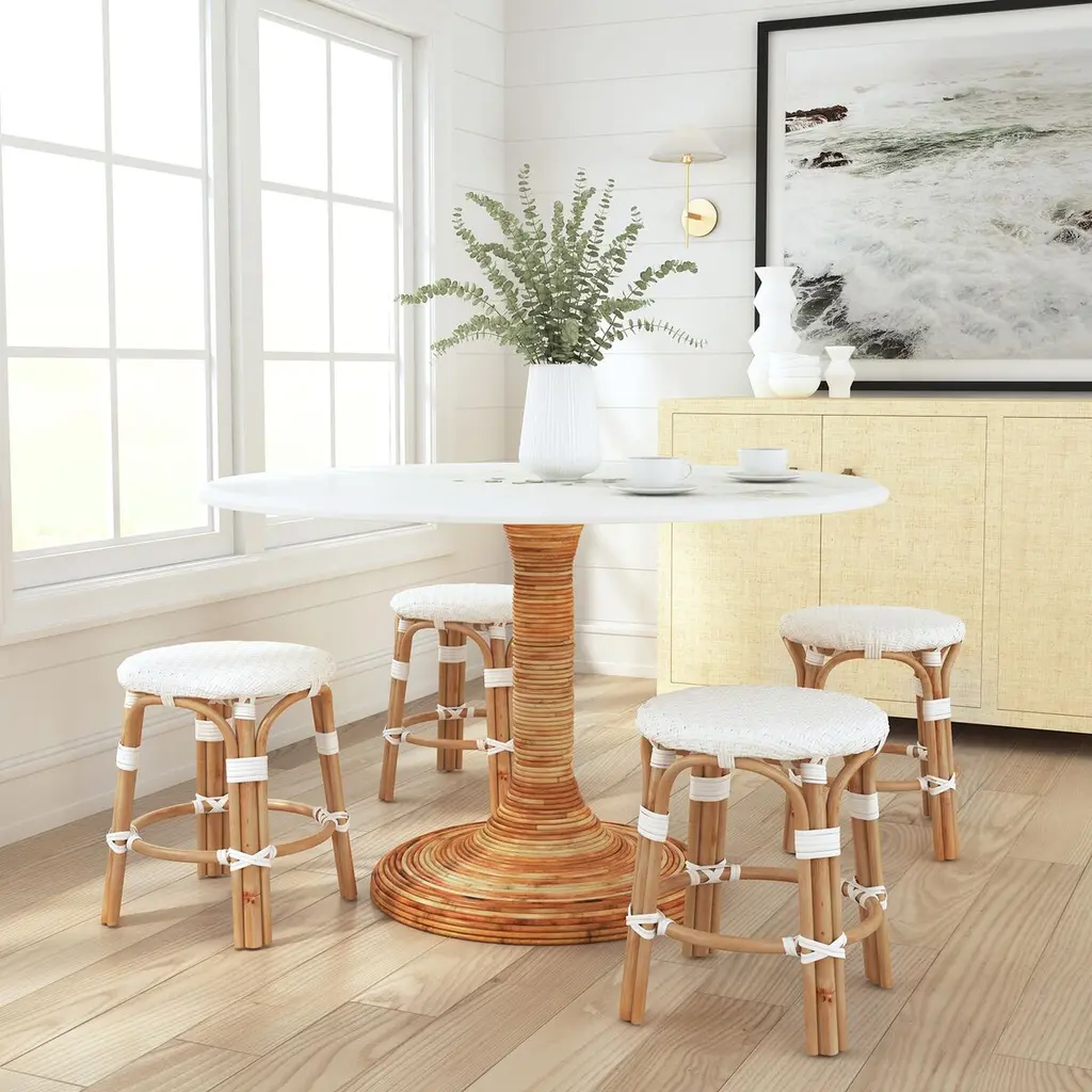Evoking images of sidewalk tables in the Cote d' Azur, dining stools like this will give your kitchen or patio the casual sophistication of a Mediterranean coastal bistro. Skillfully crafted from thick bent rattan for superb durability, it features weather-resistant woven plastic in an updated and fresh pattern. This dining stool is lightweight for easy mobility with comfort to make the space it's in a frequent gathering place.