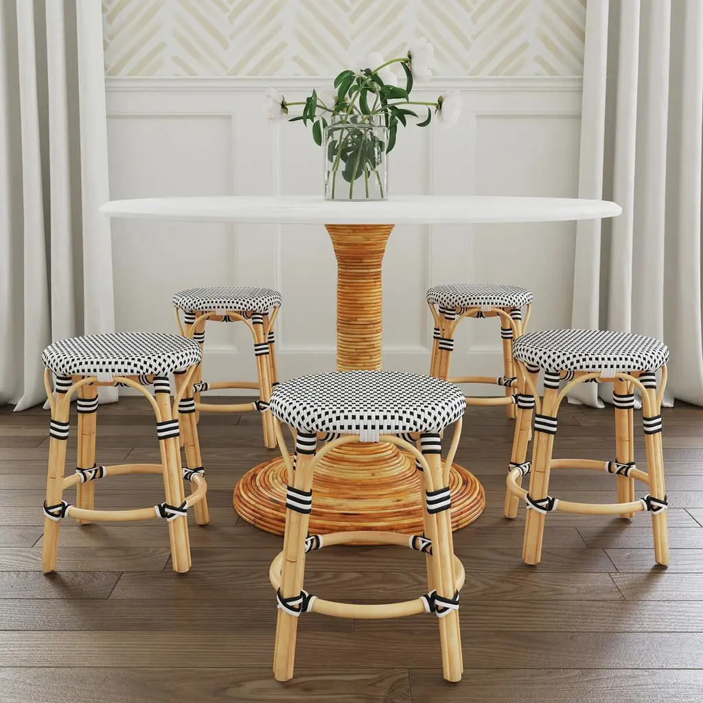 Evoking images of sidewalk tables in the Cote d' Azur, dining stools like this will give your kitchen or patio the casual sophistication of a Mediterranean coastal bistro. Skillfully crafted from thick bent rattan for superb durability, it features weather-resistant woven plastic in an updated and fresh pattern. This dining stool is lightweight for easy mobility with comfort to make the space it's in a frequent gathering place.
