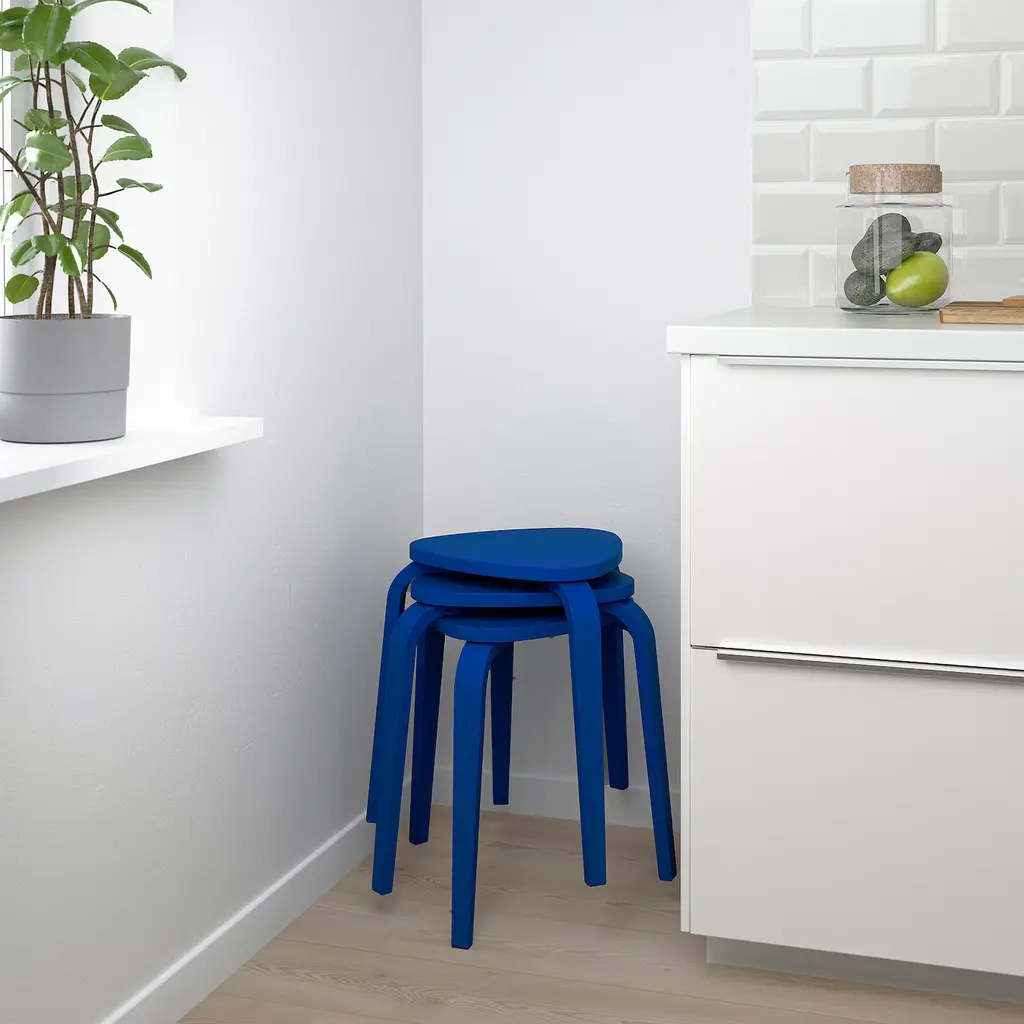 KYRRE Stool - bright blue. This all-round stool with three bent legs comes to rescue when unexpected guests pop by or you need an extra space to place your book or drink. Stackable, so you can have a few on the side for extra guests without taking up too much space. Recommended for indoor use only.