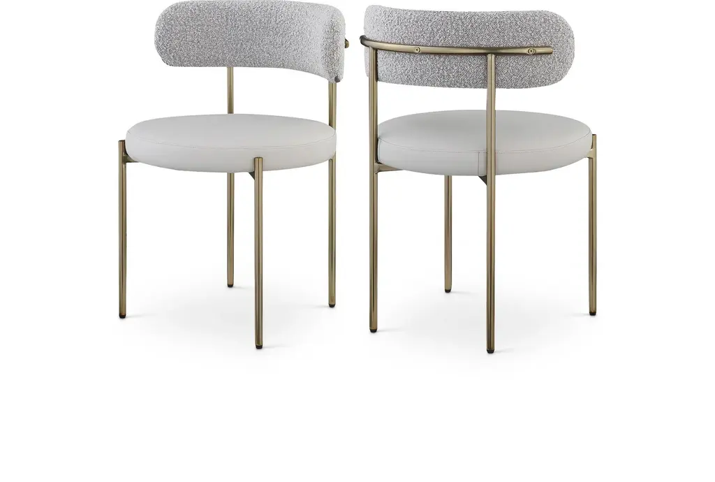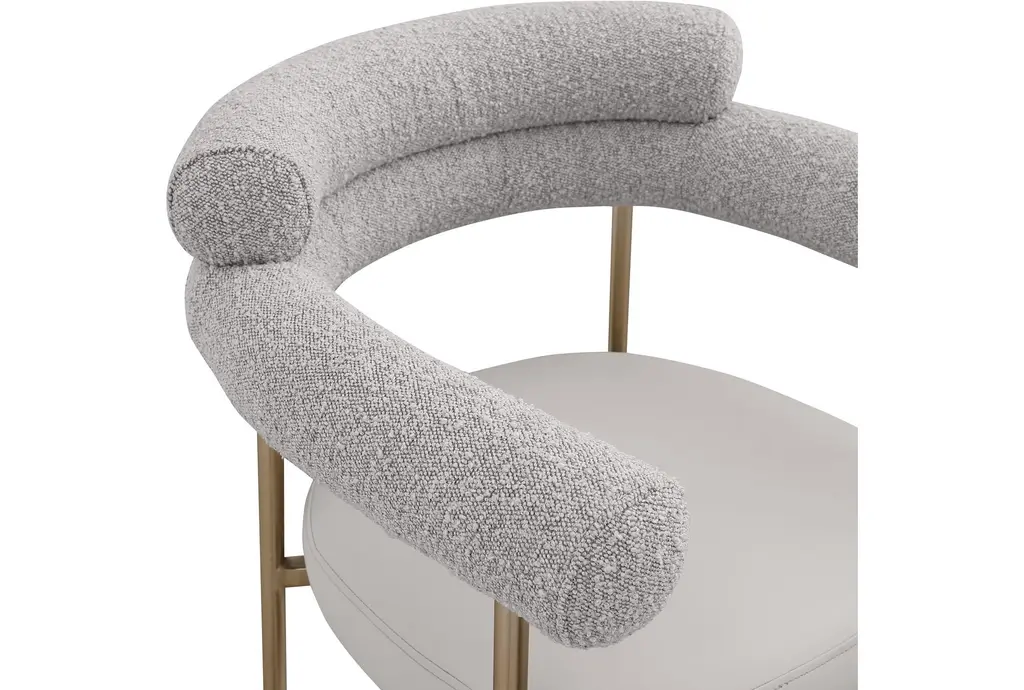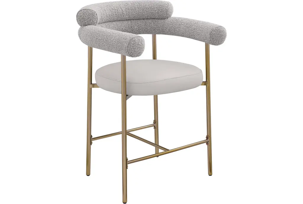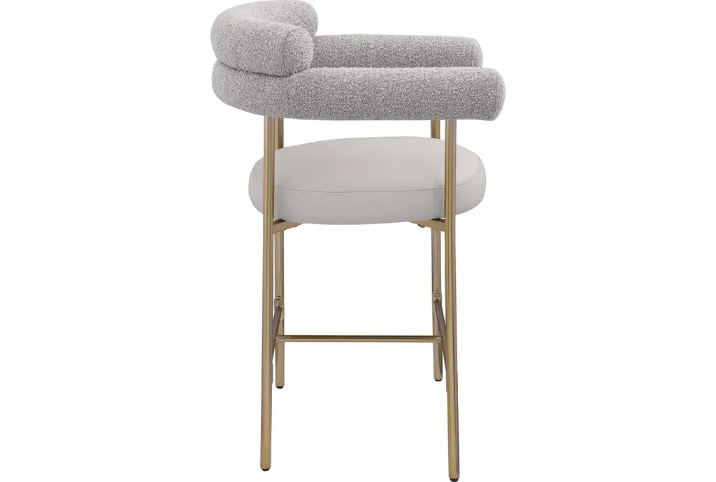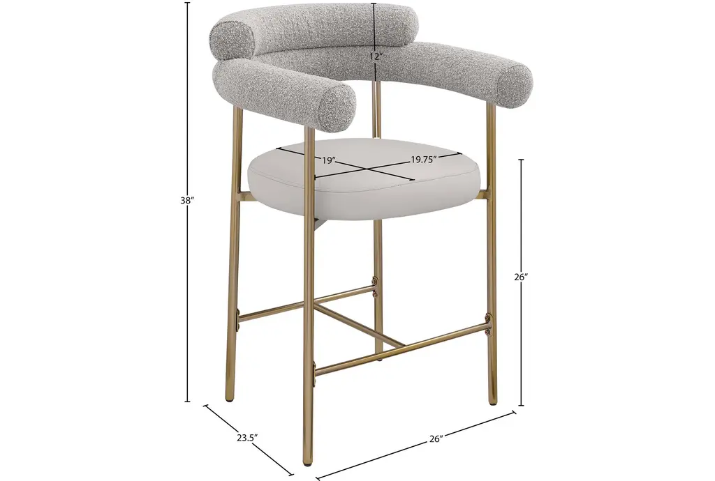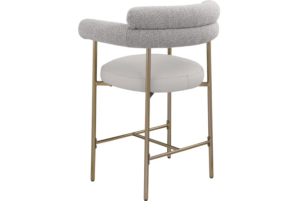 Elevate your home bar or kitchen counter with the Laki Taupe Boucle Upholstered 38" Counterstool with Brass Leg Frame Set of 2. These modern counterstools feature a soft taupe vegan leather seat and a rich taupe boucle back, providing both comfort and style. The brushed brass finish on the iron metal frame adds a touch of mid-century modern elegance to any space.