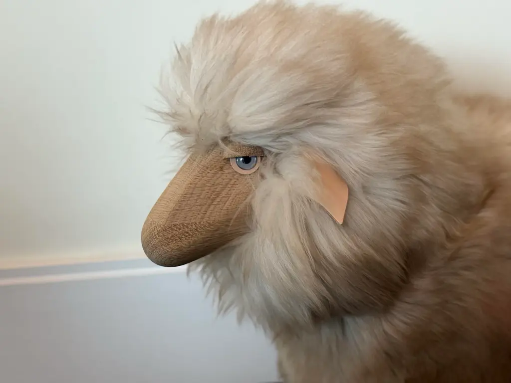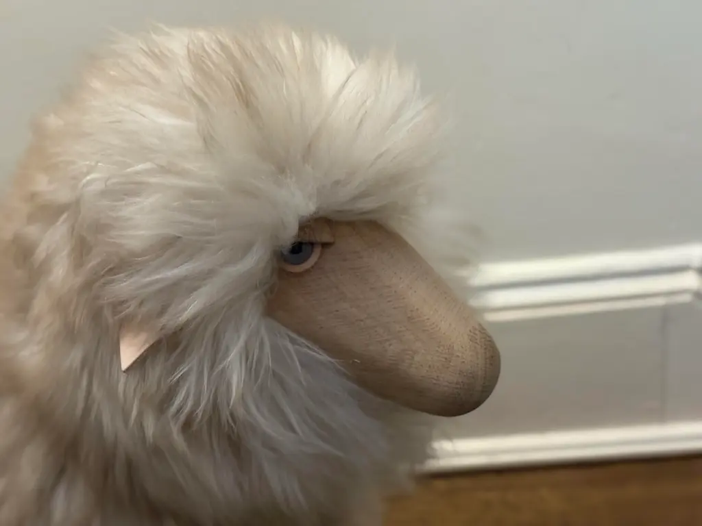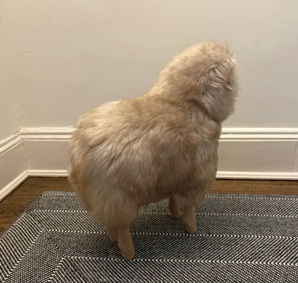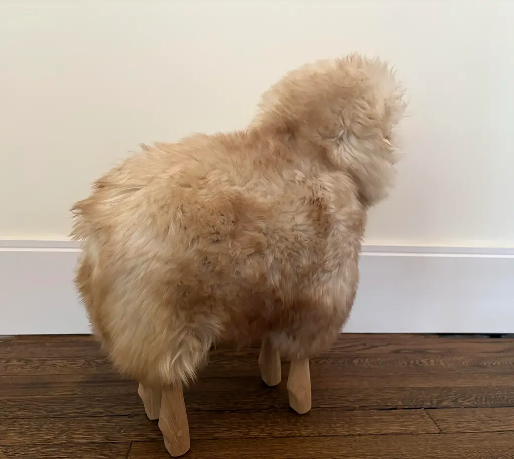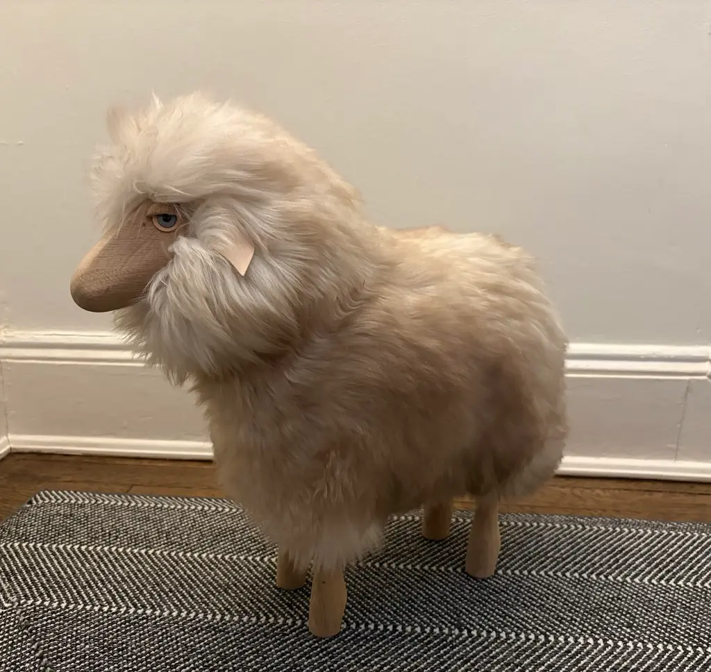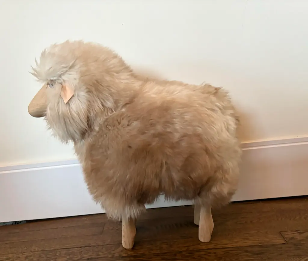 Equal parts iconic and adorable, this is a wood lamb-sized sheep in the style of Claude Lalanne. This sheep features natural wood, cream, white and tan fur, leather ears and piercing eyes.