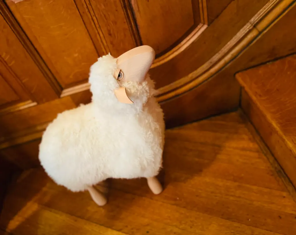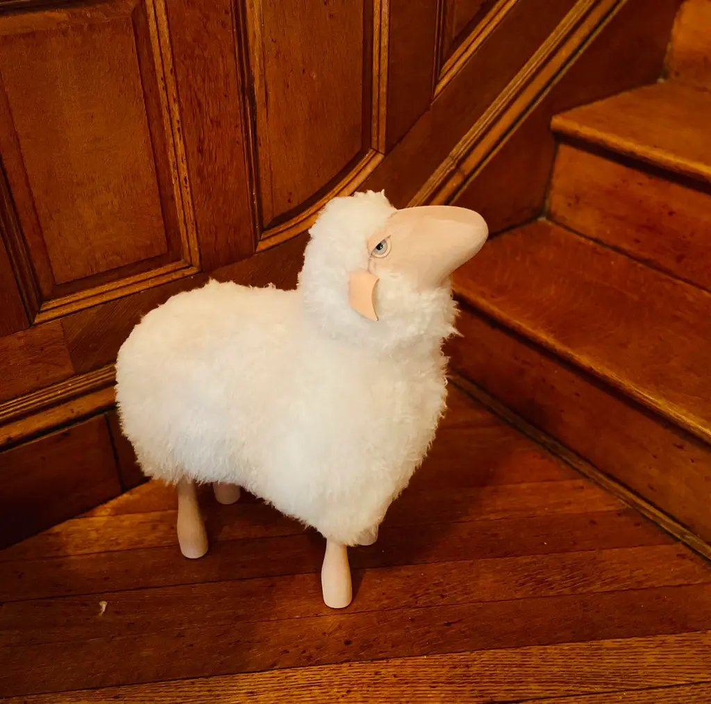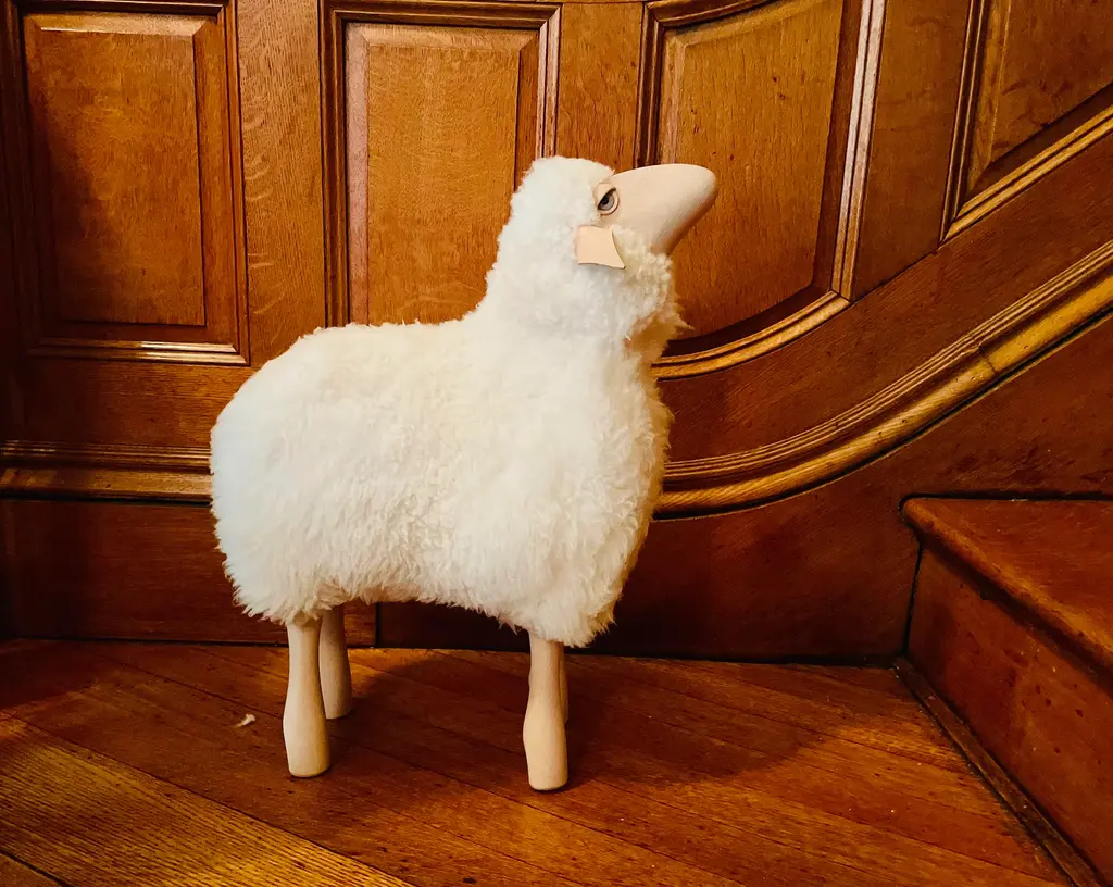 Equal parts iconic and adorable, this is a lamb-sized sheep stool or sculpture in the style of Lalanne. This sheep features off-white sheepskin over its wood frame, leather ears, and piercing eyes.