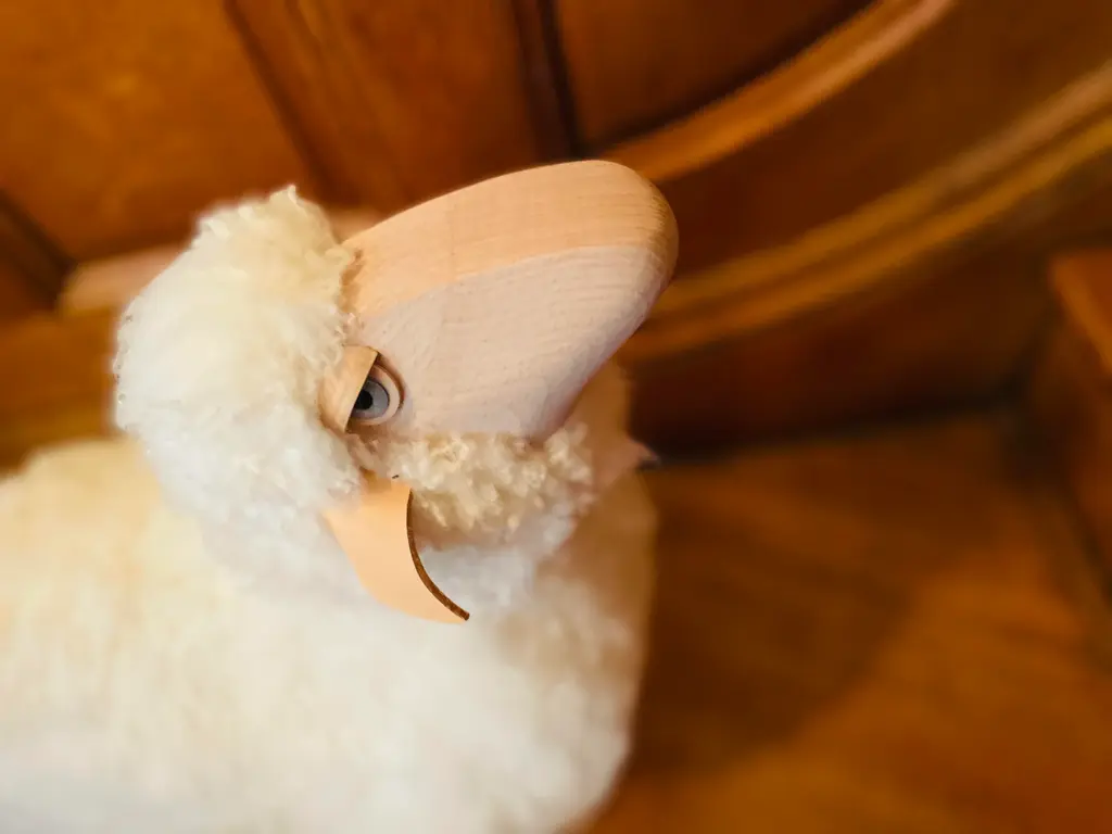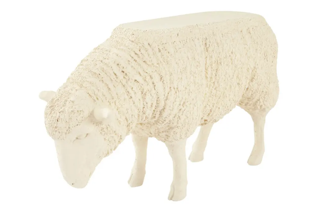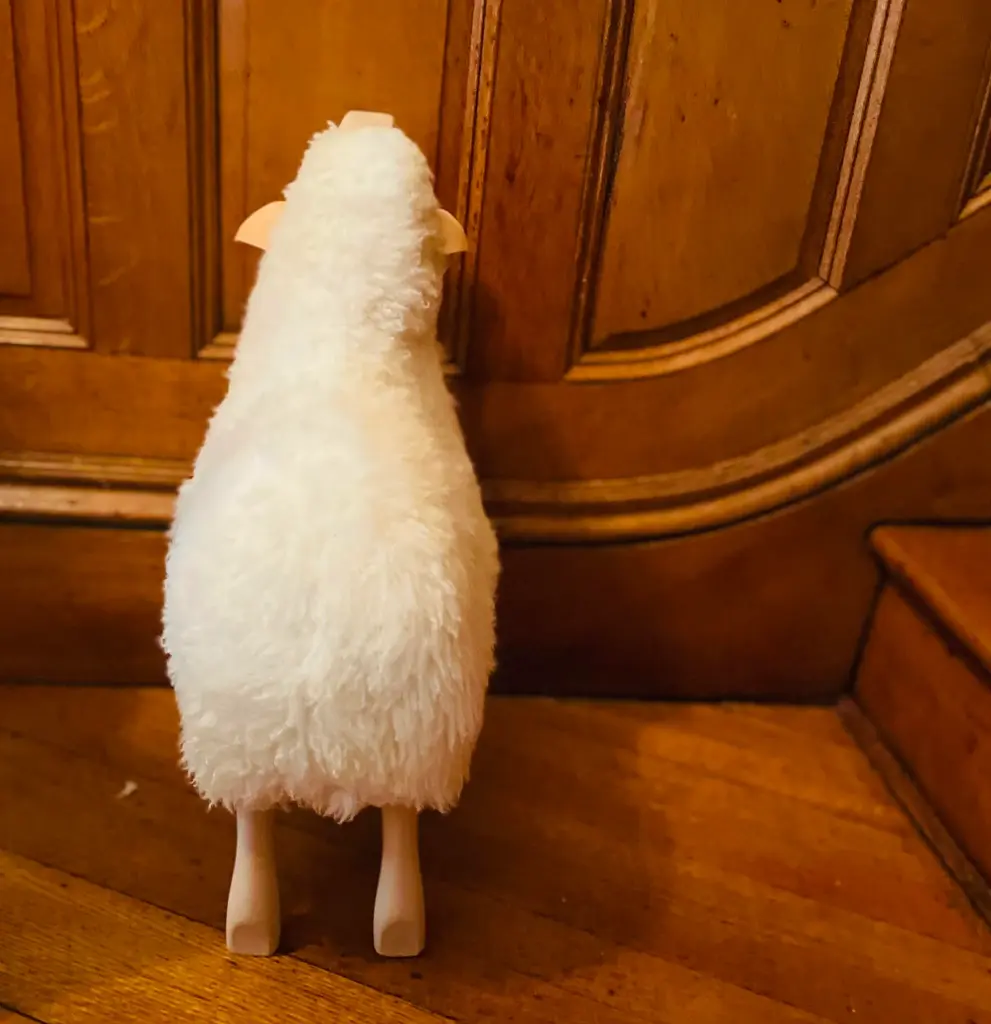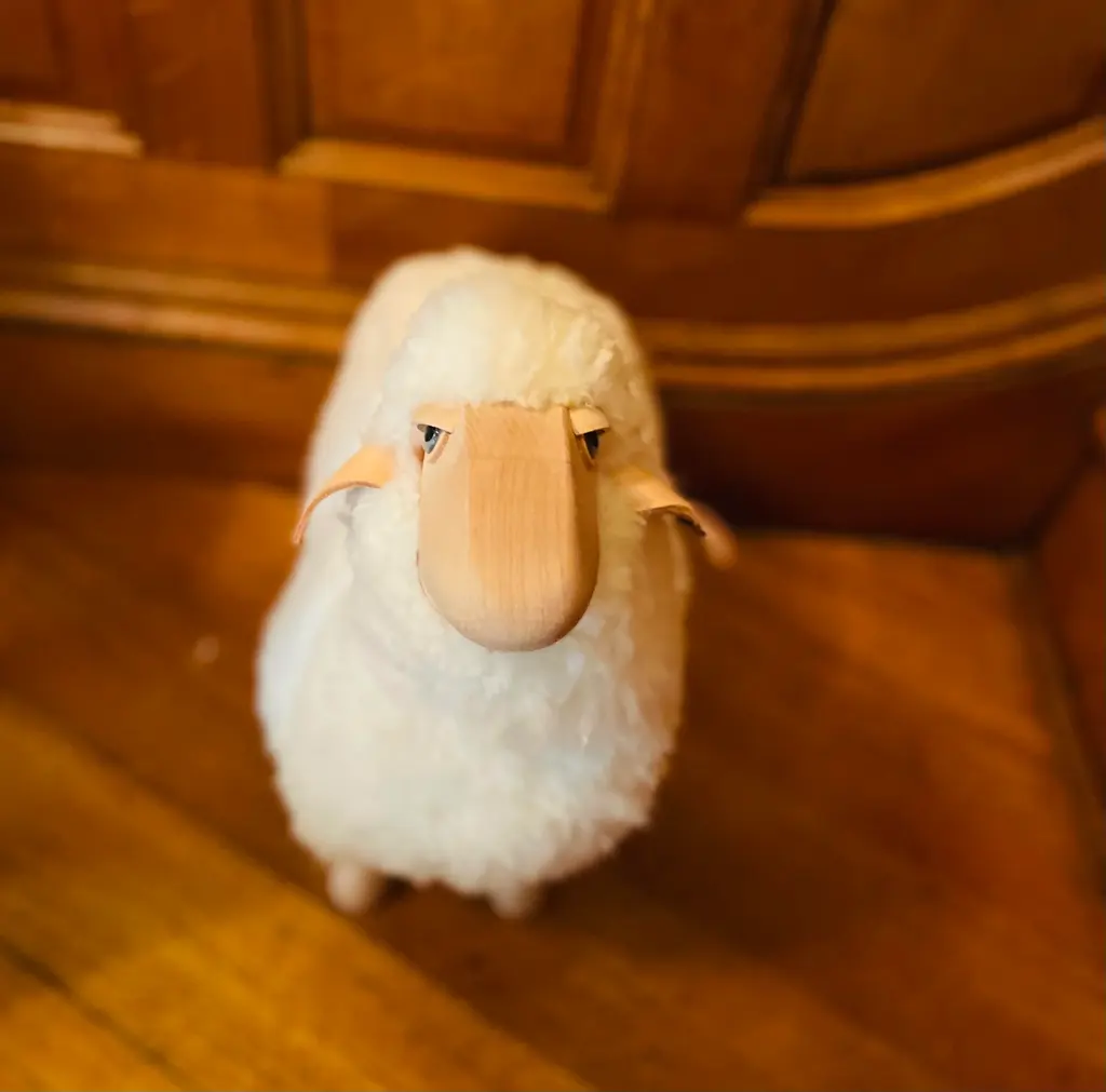 Equal parts iconic and adorable, this is a lamb-sized sheep stool or sculpture in the style of Lalanne. This sheep features off-white sheepskin over its wood frame, leather ears, and piercing eyes.