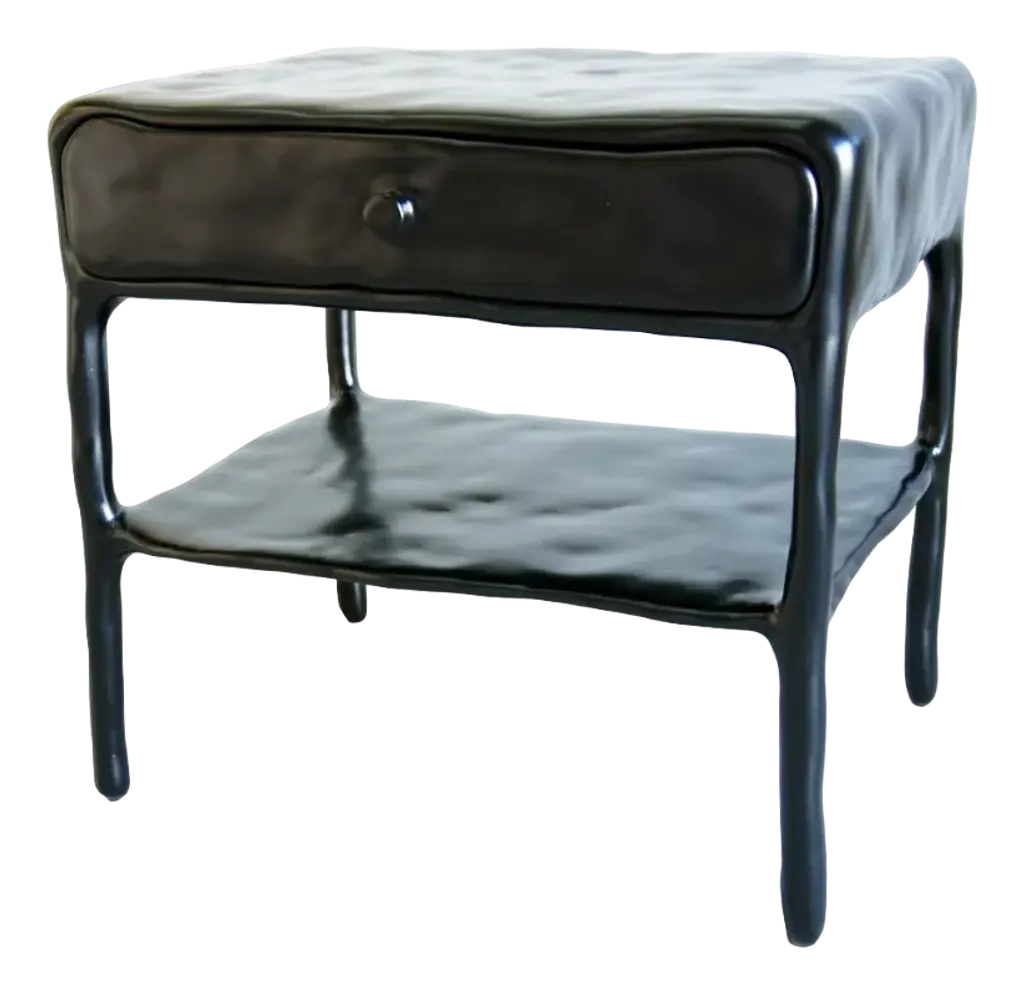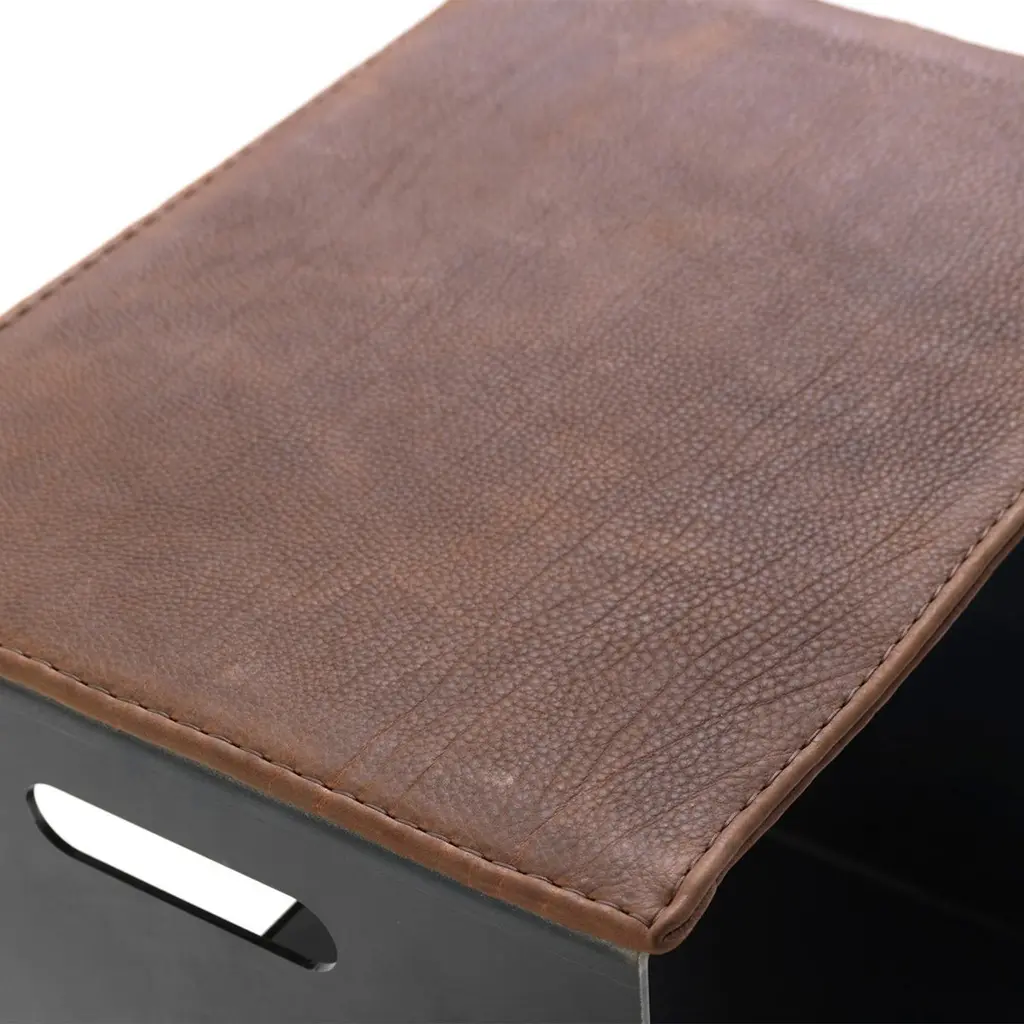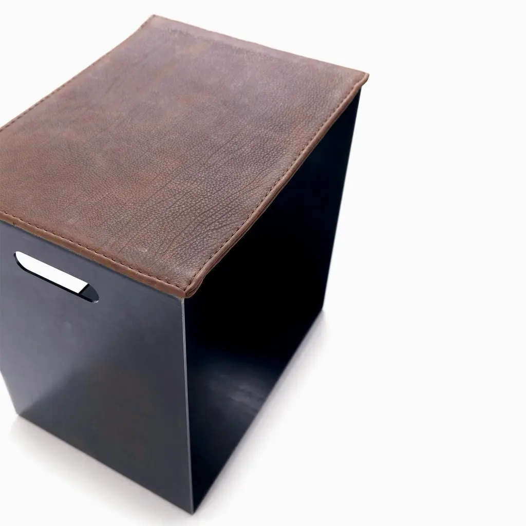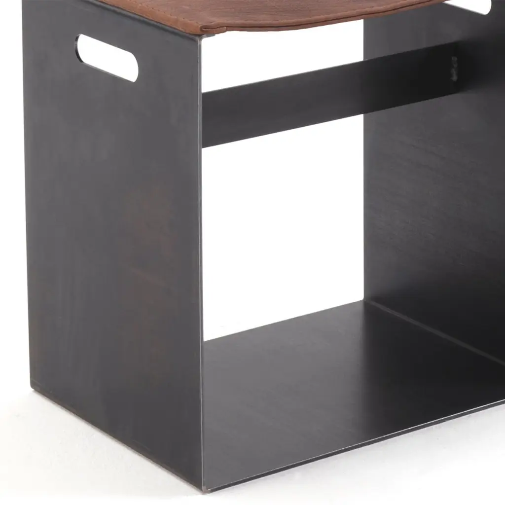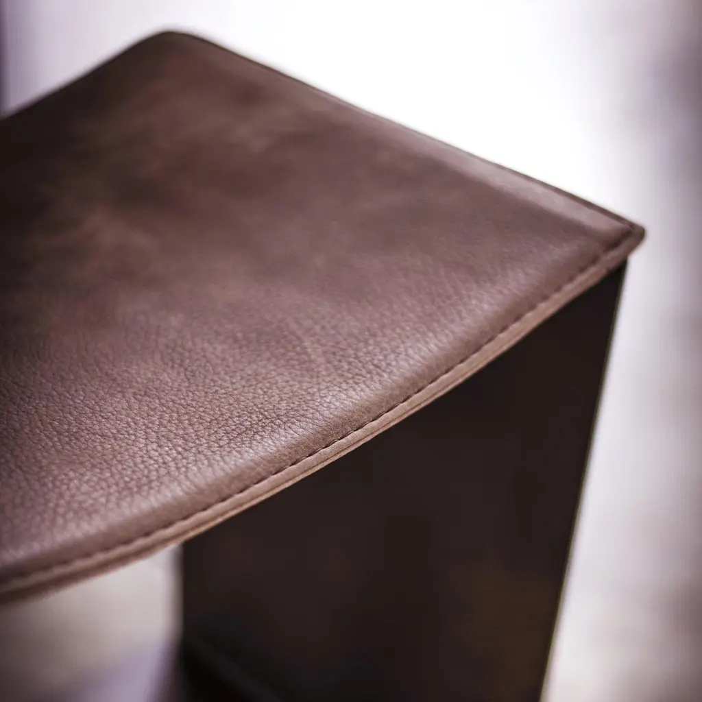 Stool leatheron with iron base in transparent lacquered finish. With highquality brown genuine leather seat.