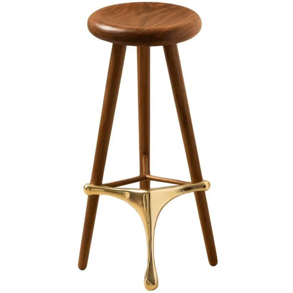 This die-cast brass stool sits stunningly upon slightly curved legs in contrasting dark oak, creating a striking visual contrast. A vertical screw is used to adjust the seat, serving as the item's focal point by emphasizing the dynamics of its mechanical structure. The stool's height is easily adjustable by a single gesture. Light oak legs are also available.