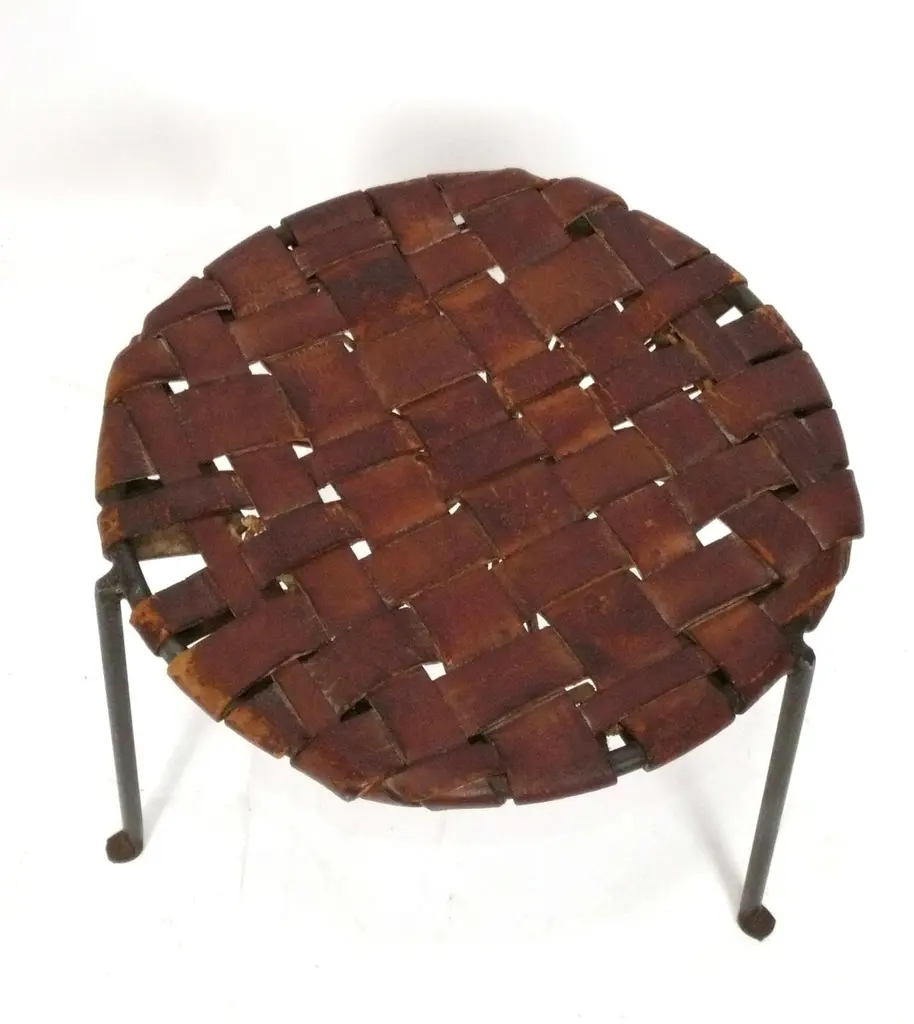 Chic Woven Leather and Iron Stools, designed by Lila Swift and Donald Monell Woven, American, circa 1950s. They retain their warm original patina. They are priced at $1600 each or $2850 for the pair. The larger stool measures 18.25"H x 15.5" diameter. The smaller stool measures 15.25"H x 12" diameter.