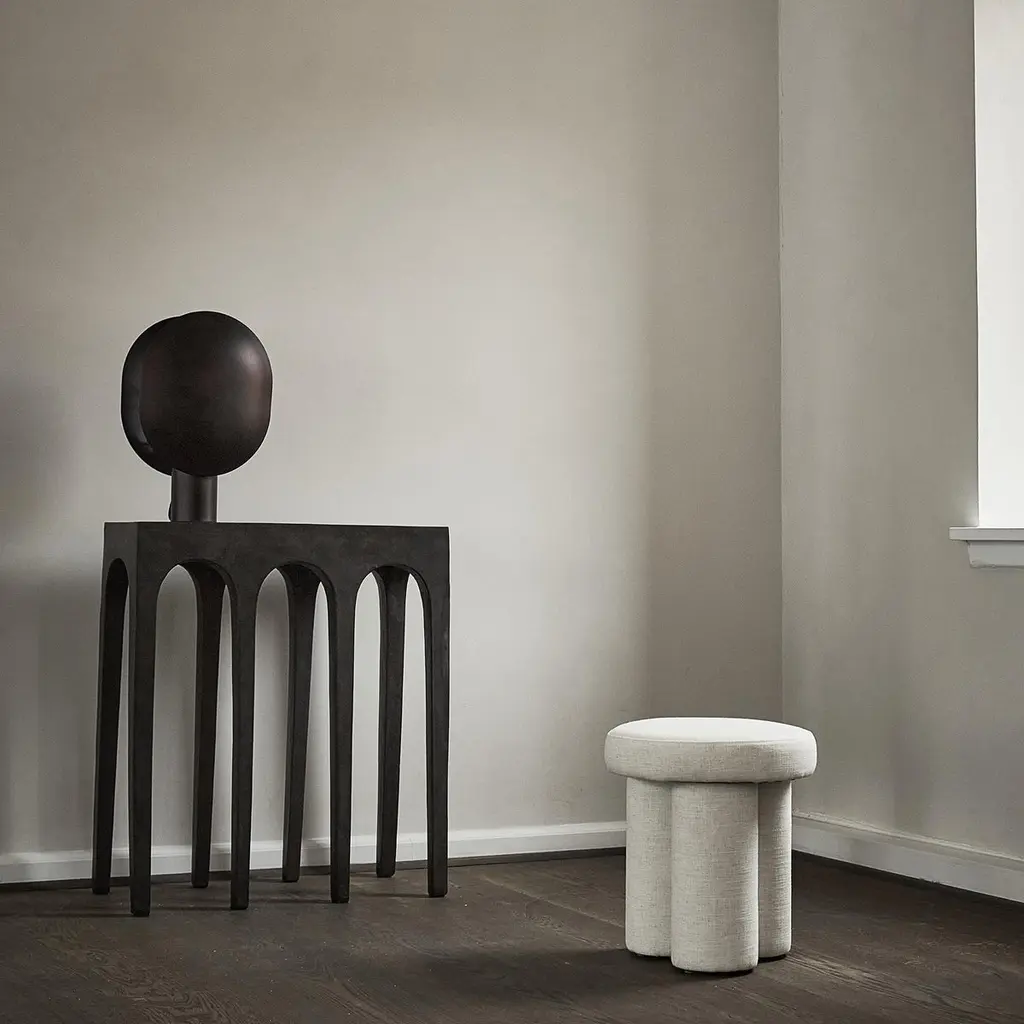 Linen big foot stool by 101 CopenhagenDesigned by Kristian Sofus Hansen & Tommy HyldahlDimensions: L 38 / W 38 /H 43 CMMaterials: LinenA quirky and contemporary addition to any interior setting and family alike, the Big Foot Stool is inviting and friendly in its sculptural, organic shape. Consisting of three circular legs and a soft, round seat, all surfaces are upholstered with naturalsheepskin in a soothing off-white colour or in chalk-colored cotton and linen fabric. 101 Copenhagen is a Danish design brand founded in 2017. With a vision to honor exquisite quality and craftsmanship, the collection encompasses furniture, lighting and accessories in a timeless, yet modern design. With a true passion for materials and refined textures, organic shapes and colours, 101 Copenhagen presents the epitome of classics and must-have novelties for Scandinavian and international interior connoisseurs alike.