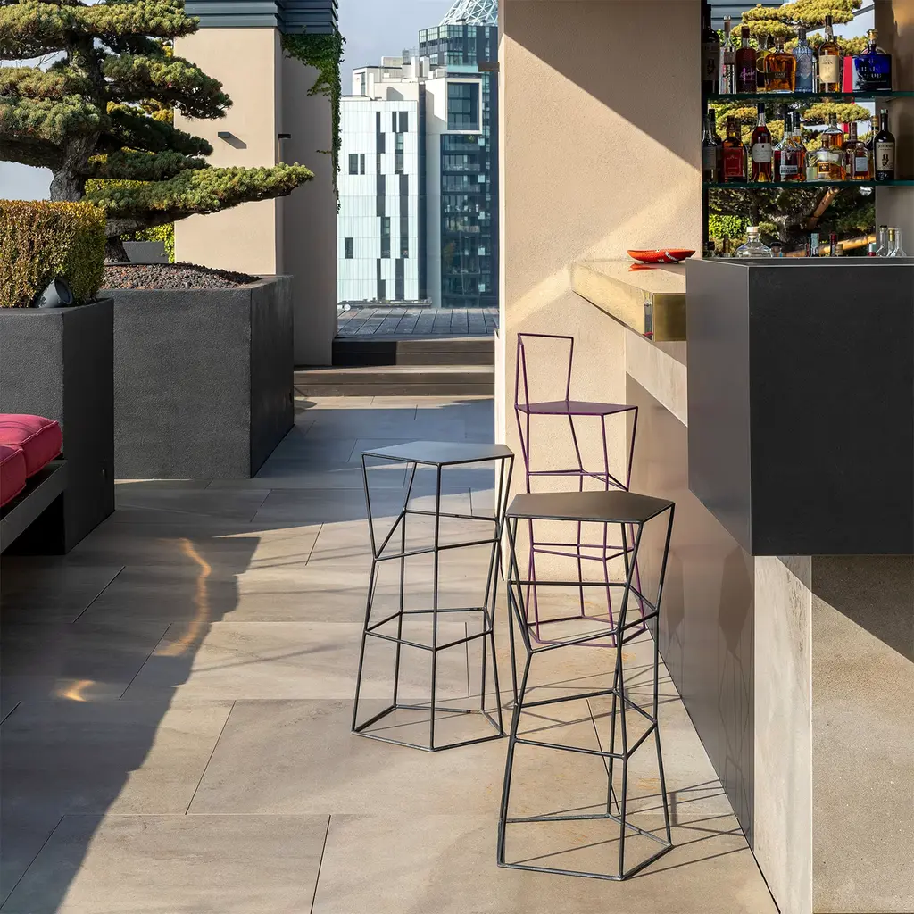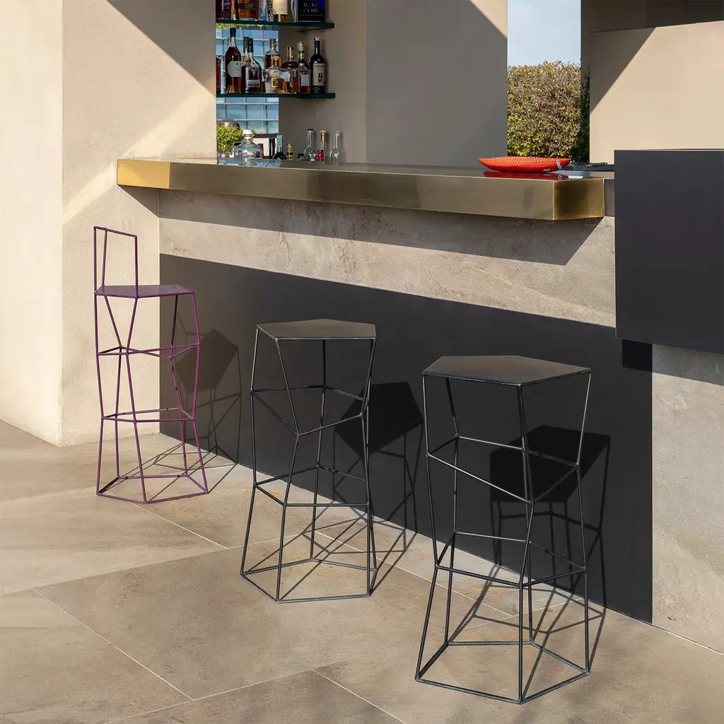 Powder-varnished in a deep black tone playfully inspired by licorice, this stool makes for a spot-on addition to refined contemporary-style settings both indoors and outdoors. The airy and irregular silhouette - carefully handmade from tempered iron wire - reveals an unmistakable geometric mark of striking visual impact. Milk-white and blueberry color variants are also available. Please contact the Concierge for details and pricing.
