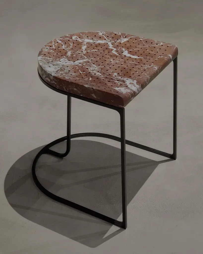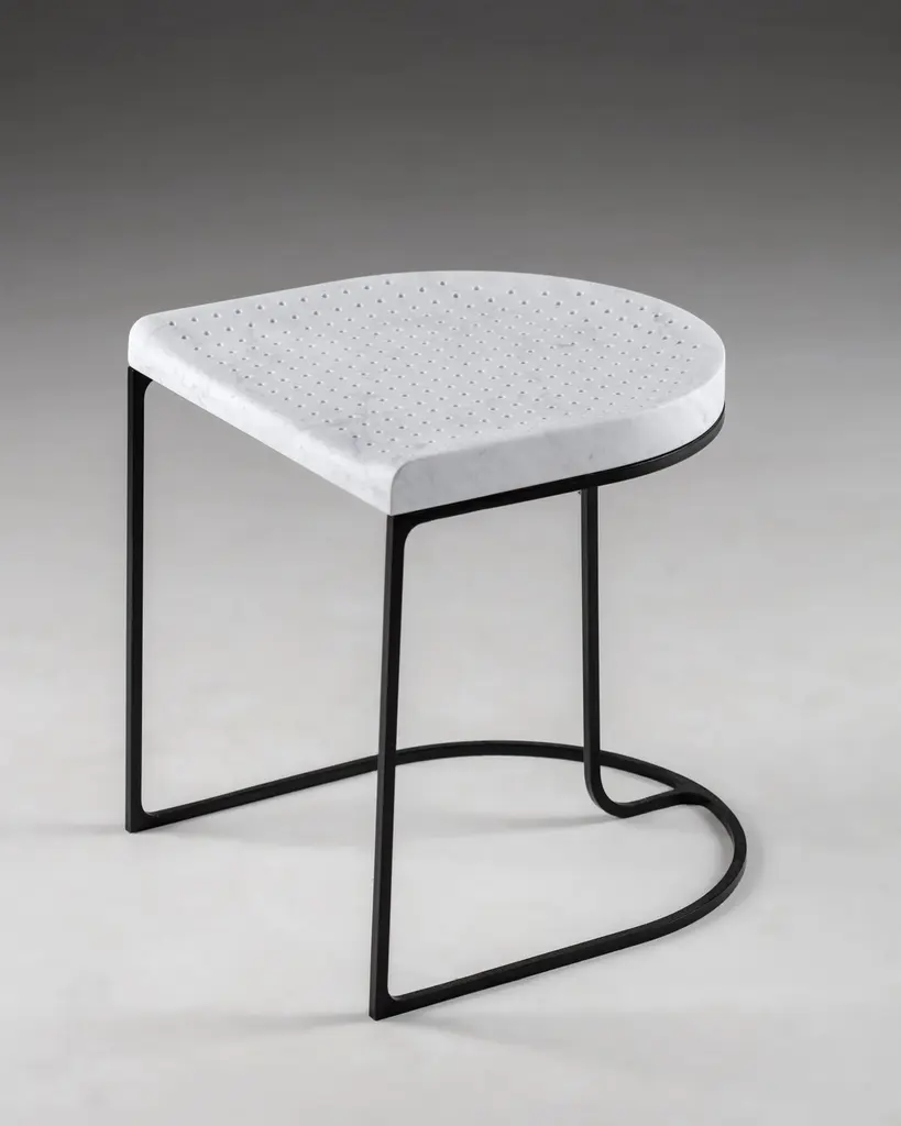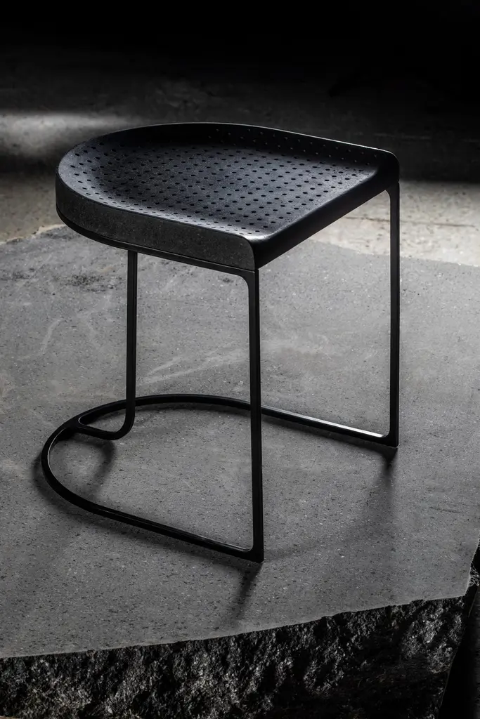 Etna Stool design Martinelli Venezia StudioStoolMaterials: Iron structure varnished with an opaque black powder, top inVolcanic Stone or Bianco Carrara honed finishDimensions: 400 x 445 x H 450 mm.