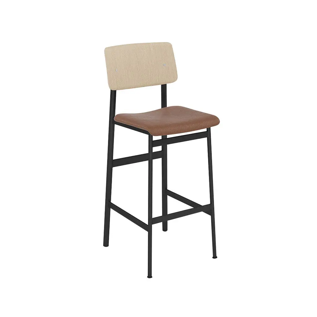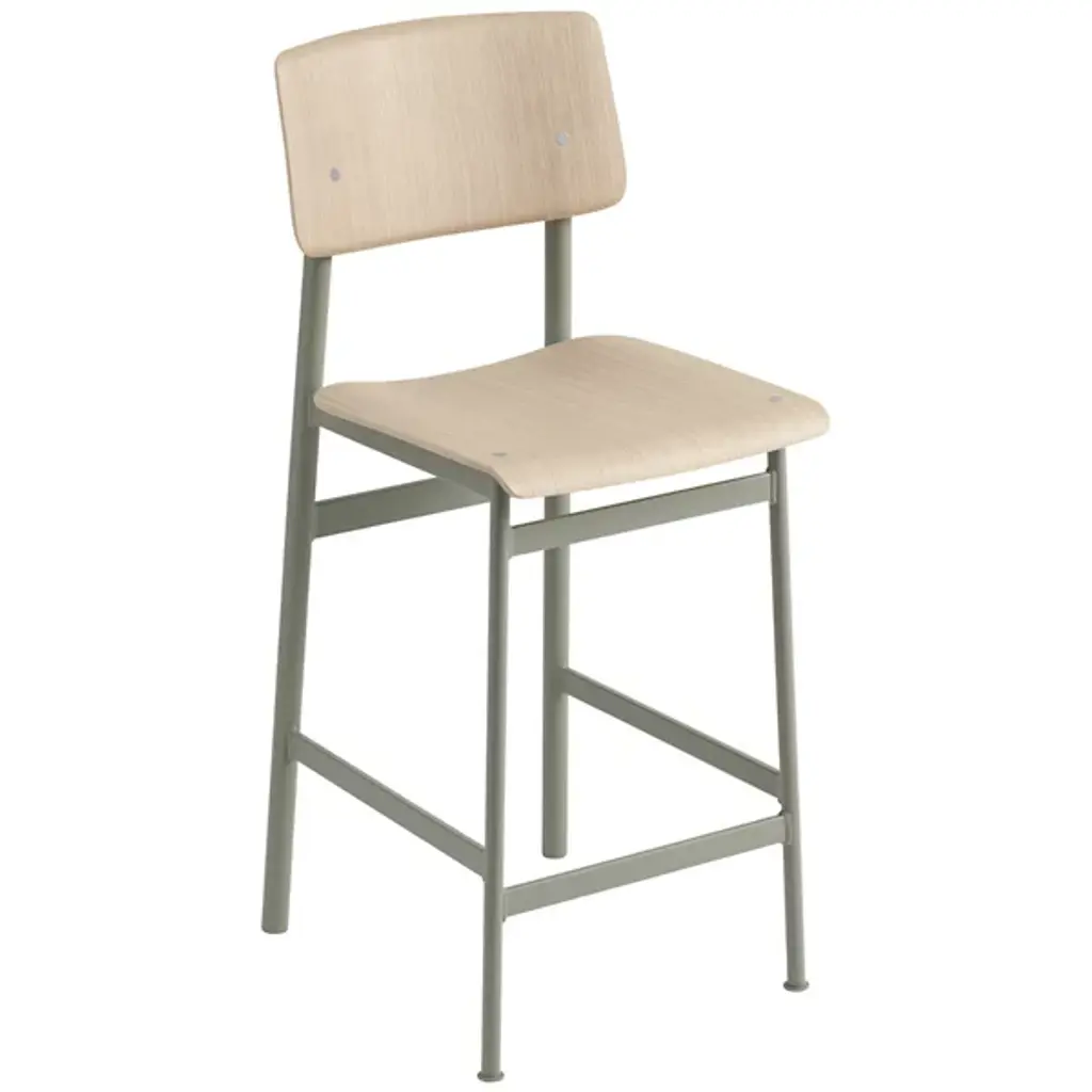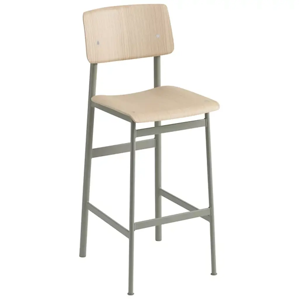 Simple, straightforward, and strong. The Loft Stool from Muuto offers an appealing industrial accent to indoor living spaces. Ideal for providing seating at bars or counters, it rises from a four-legged structure in powder-coated steel, the slender front legs and more robust back legs ascending to a sleek seat and back made of curving plywood. Both seat and back contrast well with the metal structure beneath it, each one secured with strong, flush-fitting bolts that provide a final element of contrast.
