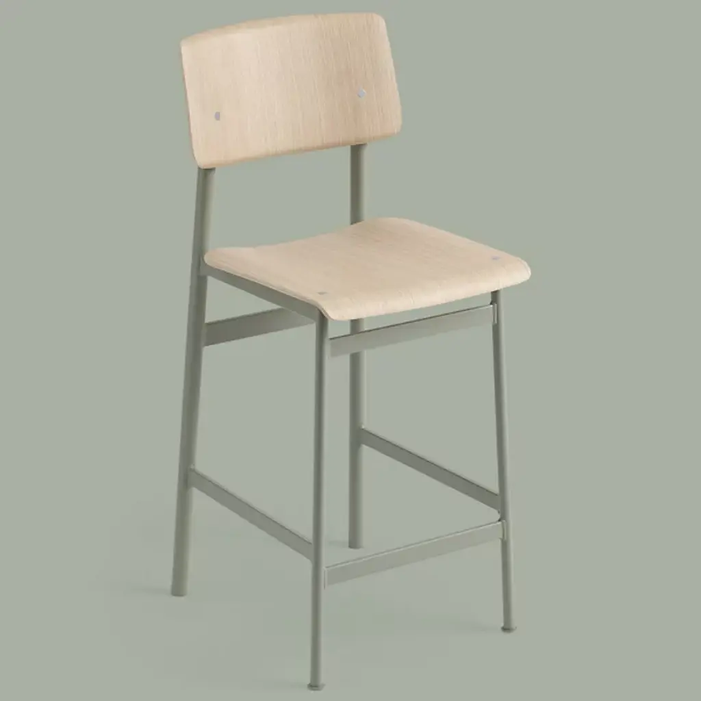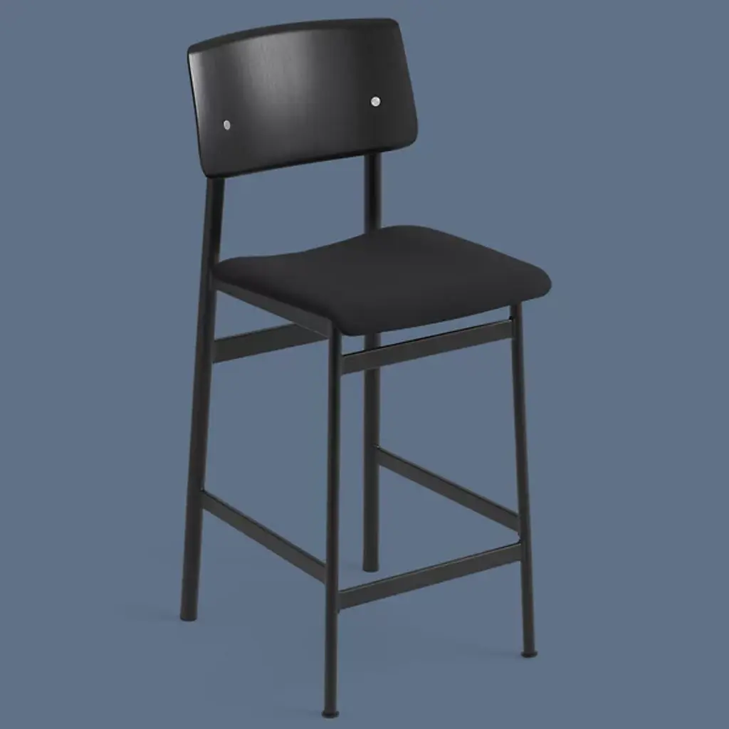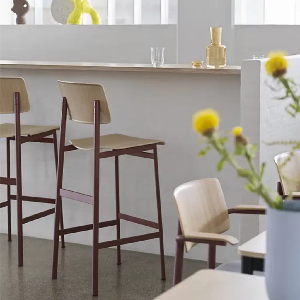 Simple, straightforward, and strong. The Loft Stool from Muuto offers an appealing industrial accent to indoor living spaces. Ideal for providing seating at bars or counters, it rises from a four-legged structure in powder-coated steel, the slender front legs and more robust back legs ascending to a sleek seat and back made of curving plywood. Both seat and back contrast well with the metal structure beneath it, each one secured with strong, flush-fitting bolts that provide a final element of contrast.