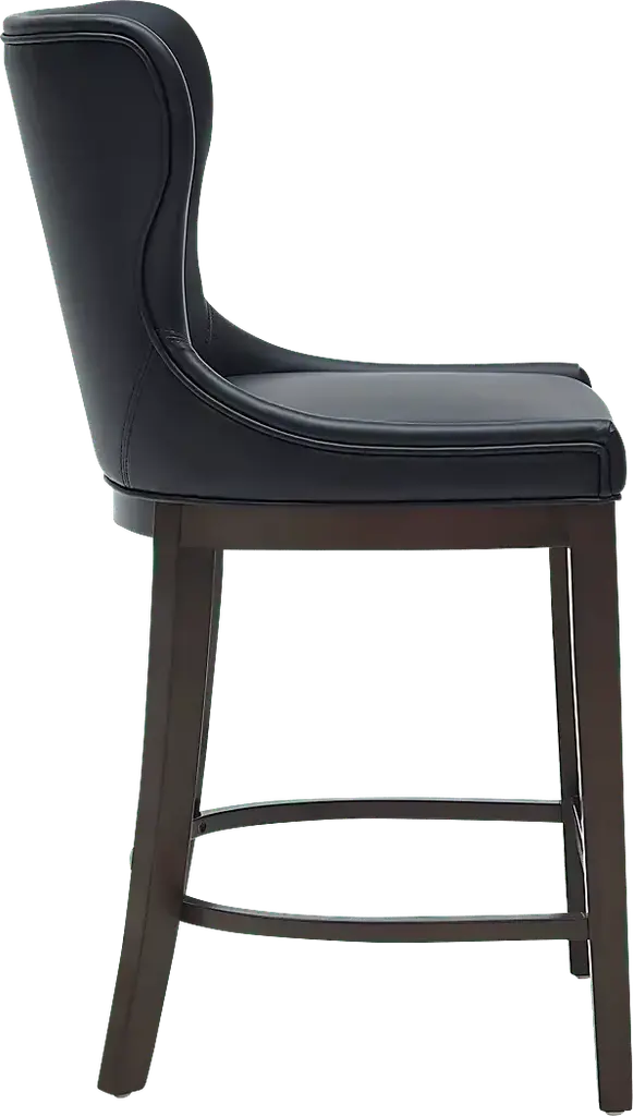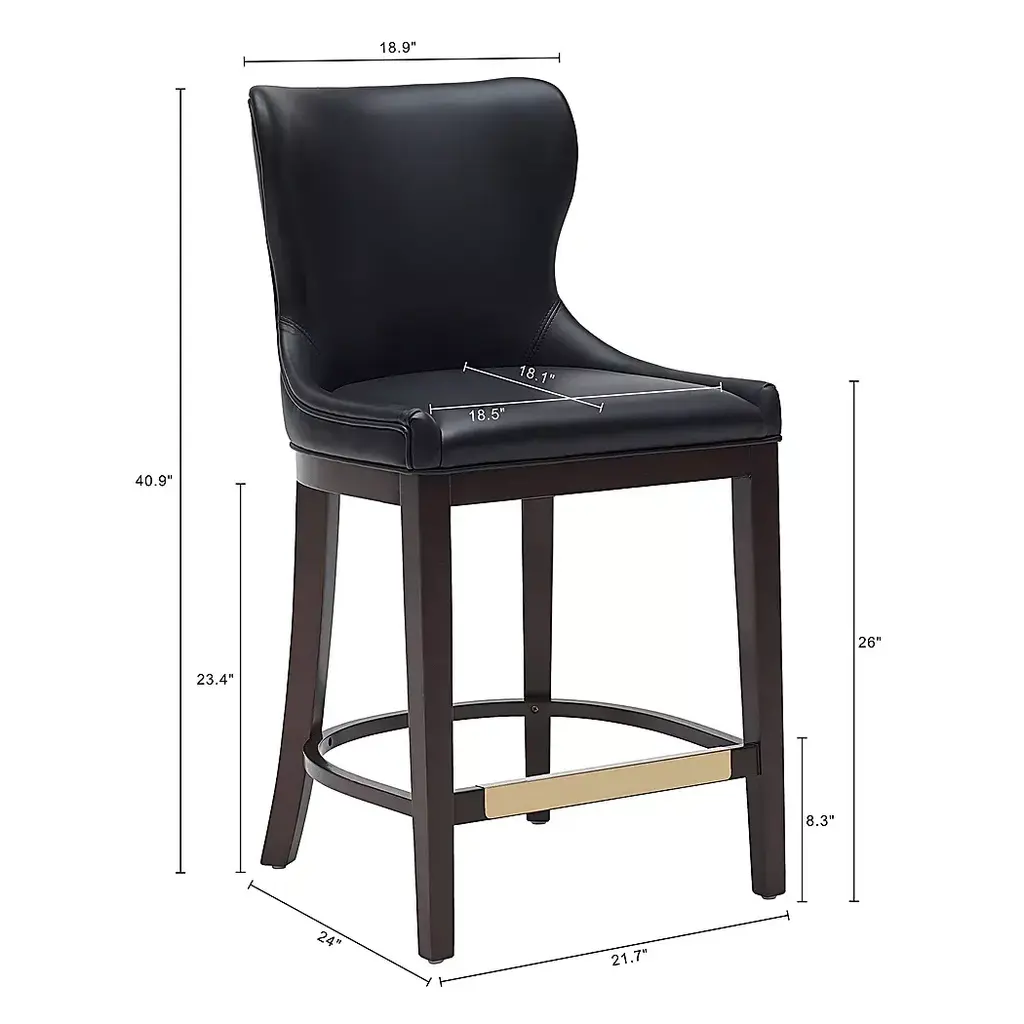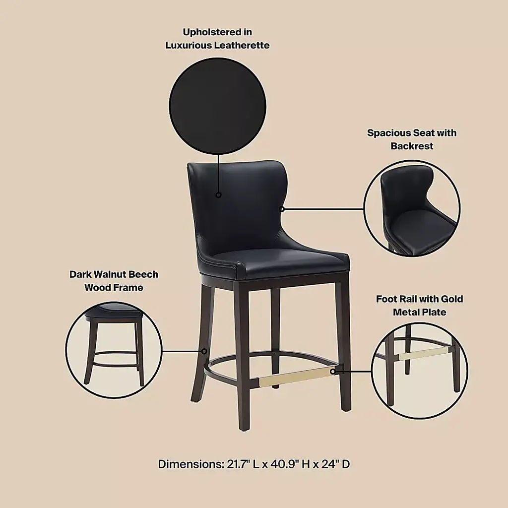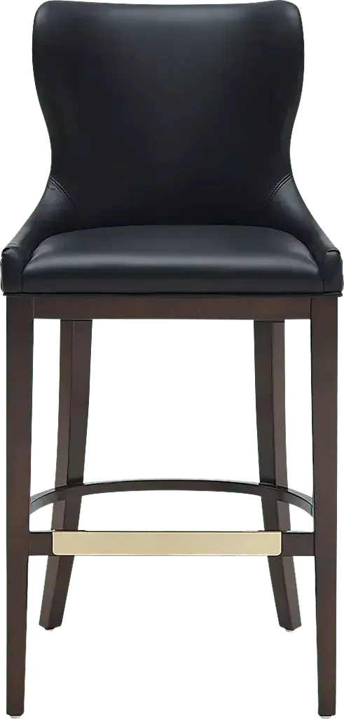 Elevate your everyday with the Lucentwater black counter height stool. A gently curved backrest and plush padded seat deliver the perfect balance of style and support, wrapped in smooth faux leather for a sleek, modern feel. The dark wood frame is grounded in warmth, while a gold-finished footrest adds just the right touch of polish. Whether you're sipping coffee or sharing cocktails, this stool brings comfort and elegance to every moment.