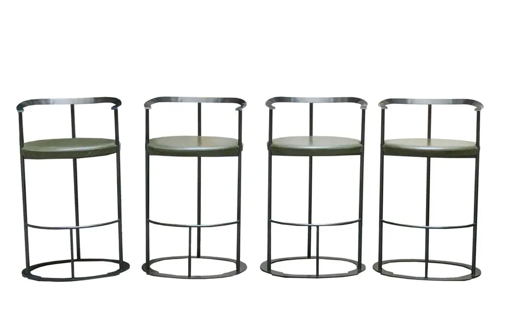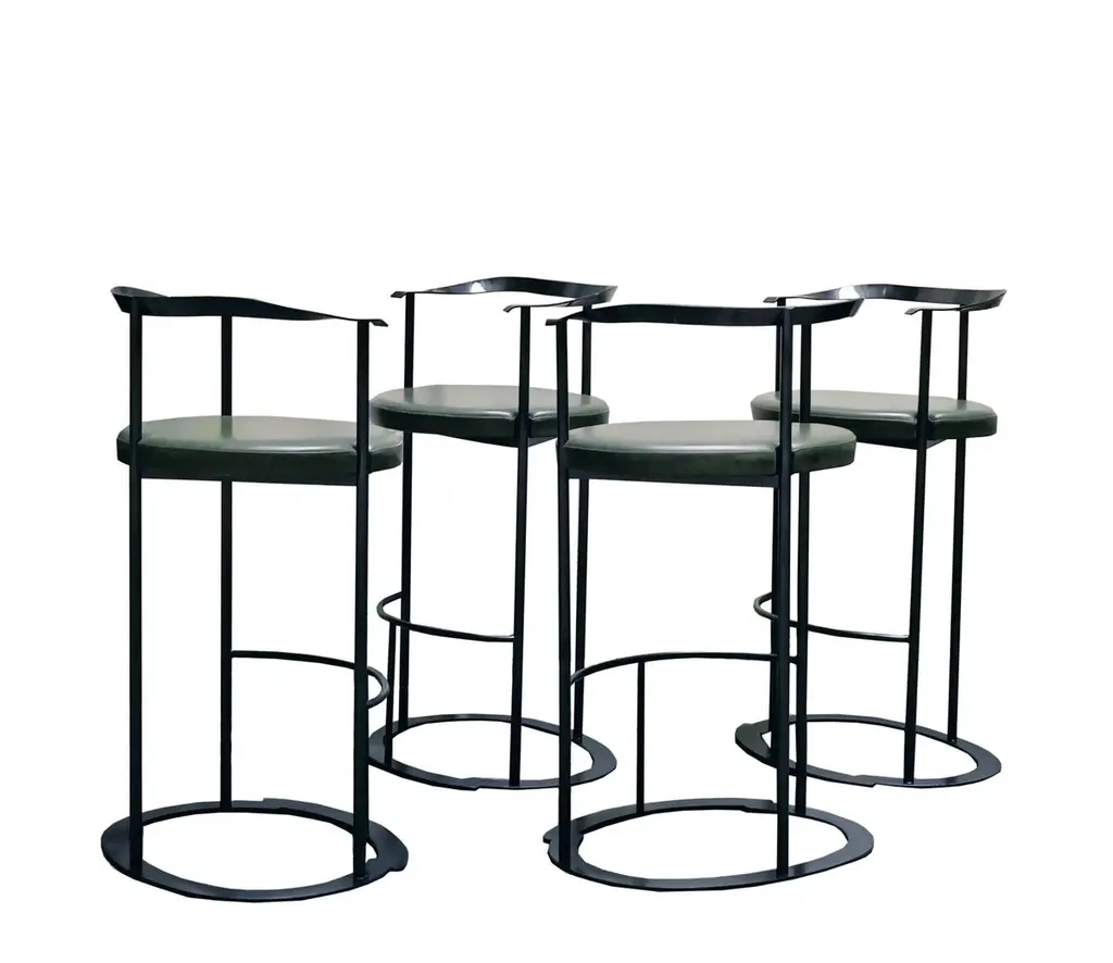 Four Catilina stools with painted steel frame, plywood seat top and polyurethane cushions upholstered and covered in green Claudio Valtorta leather. This iconic seat was designed by Luigi Caccia Dominioni, and produced by Azucena since 1958.Luigi Caccia Dominioni firstly presents this seat at the XI Triennale in Milan in 1957 and from this moment Catilina became one of Luigi Caccia Dominioni’s classics. Azucena mark under the base
